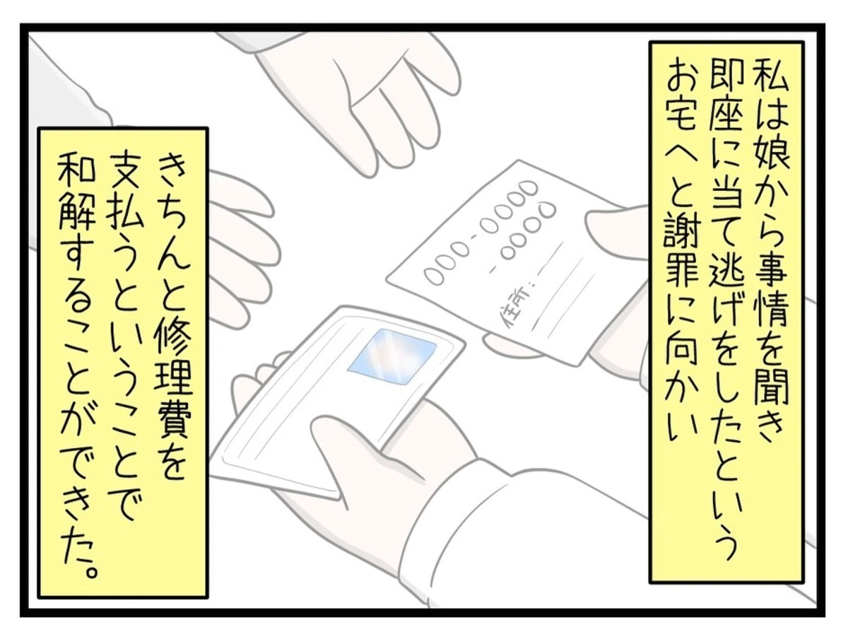 母と謝罪に訪れ、修理代を弁償したことで和解することができました。本当によかったですね。あとは、この卑劣な男性を撃退するだけです。