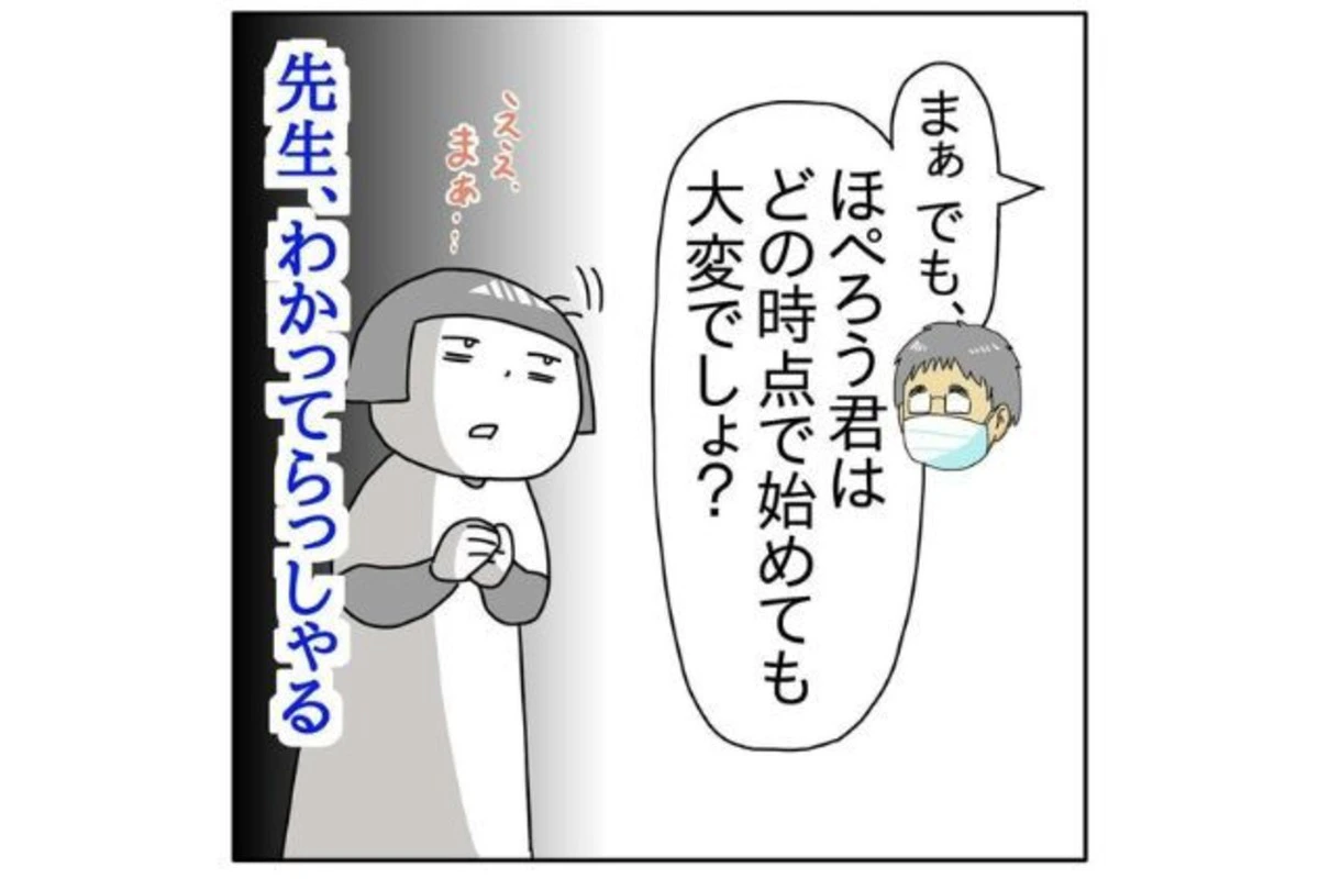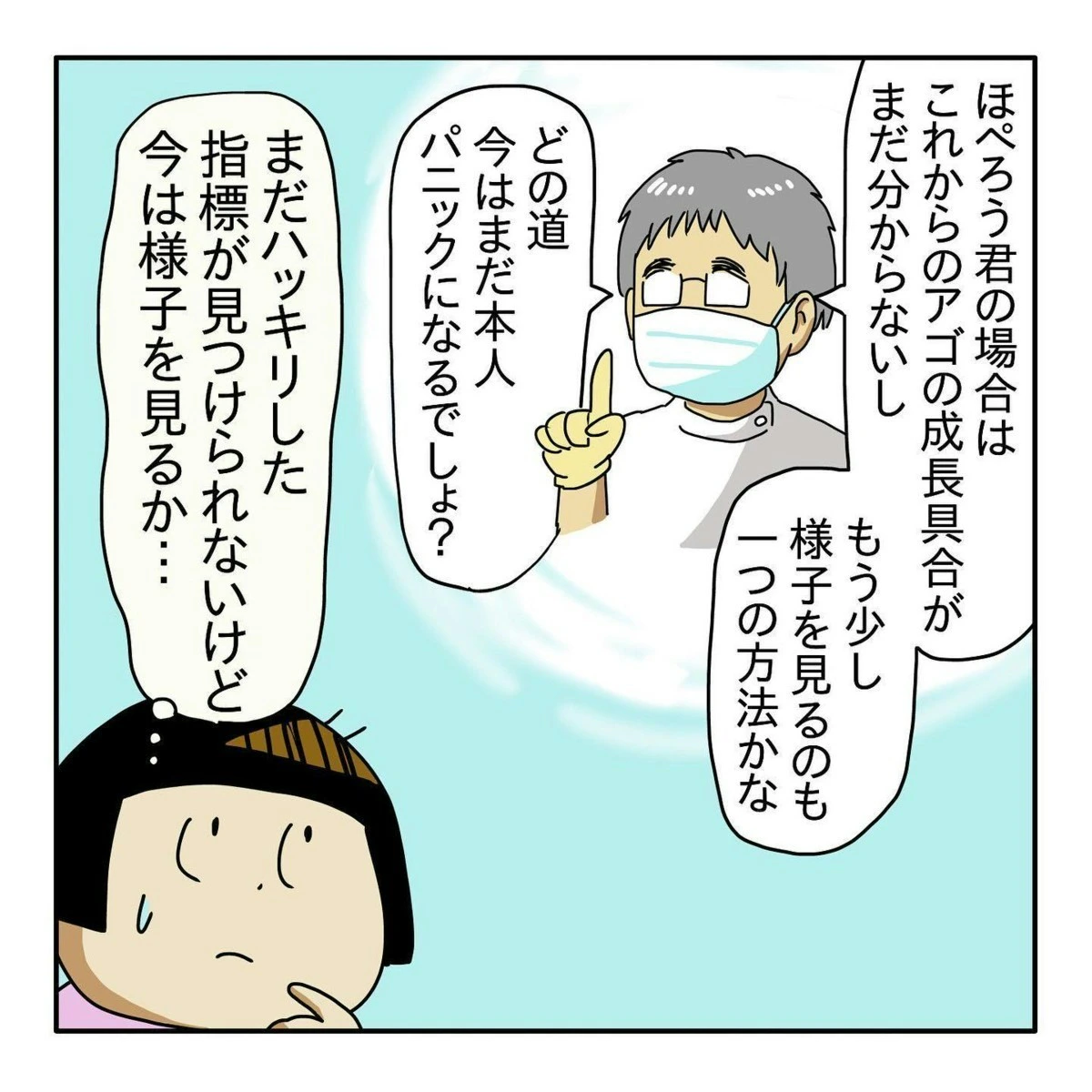 元々は、グラグラしていた乳歯を抜いてもらうために予約していた歯科。ところが、予約日を前に抜けてしまったため、歯並びの相談をします。すると、ほぺろうくんはアゴが小さいため、永久歯が生えるためのじゅうぶんなスペースがないため、「曲がって生える」と指摘されてしまったのです。