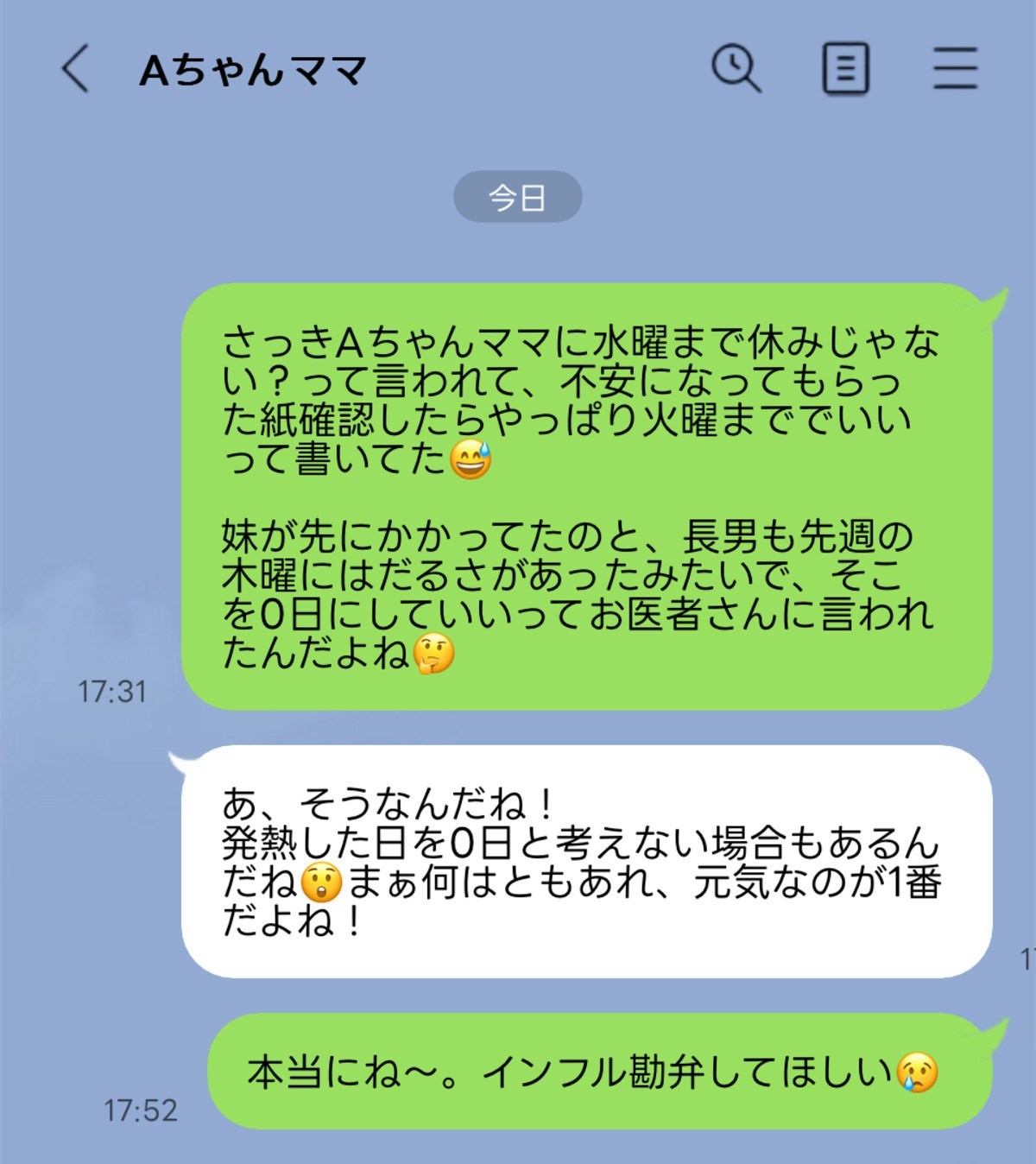 「あ、ウチのコ(息子と同じクラス)から、今日息子くん早退したって聞いてたよ!早く治るといいね、お大事にね😭」