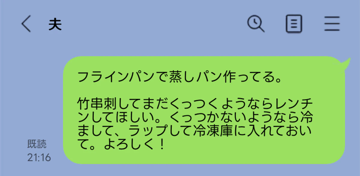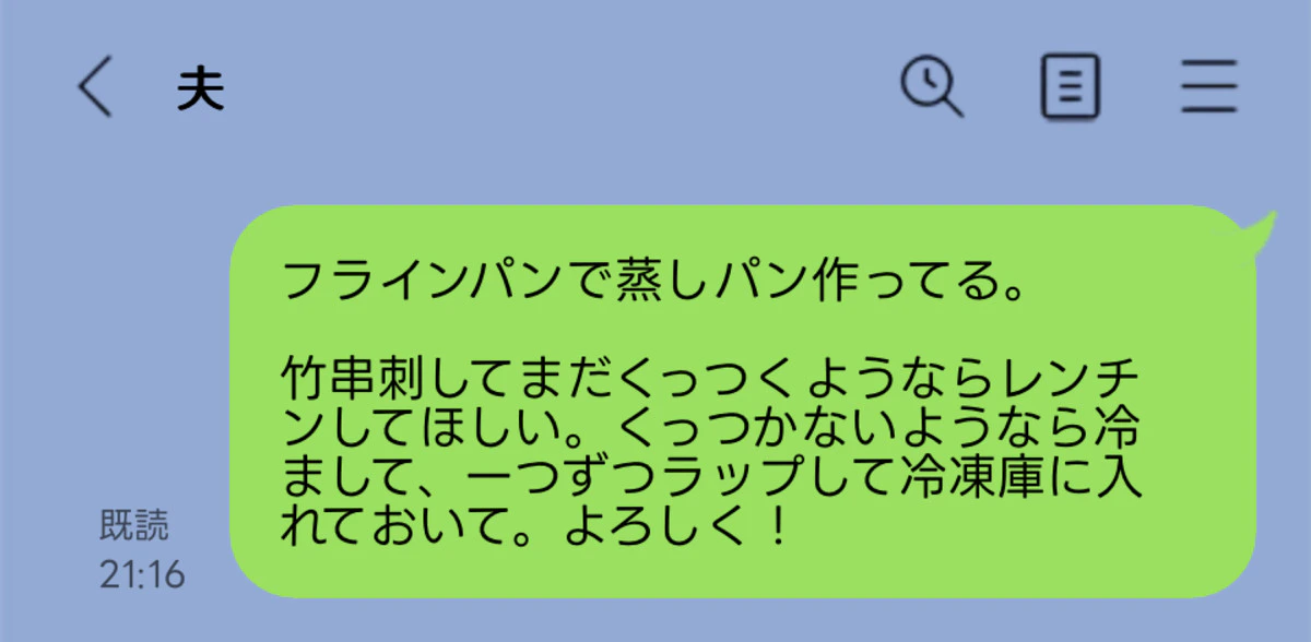 昨日、離乳食用の蒸しパンをフライパンで作っていたんです。夜の寝かしつけ中に旦那にLINEで「蒸しパンさ、竹串に通してまだくっついてくるようなら、電子レンジでチンしてほしい。竹串にくっついてこないようなら冷まして、冷めたら包んで冷凍庫に入れてほしい」ことを送りました。返信はなく既読のみ。寝かしつけ終わって出てきたら、「これどうしたらいいの?」って言われました。「LINEで送ったよね?」って言ったら「これじゃわからない。」って言われて、あたしは「え?それじゃ何もしてないの?」って言ったら、「だってわからないもん。何分チンすればいいの?何個ずつ包めばいいの?」って。あたしは、カチンときて「いい、自分でやるから」と自分で全部やりました。