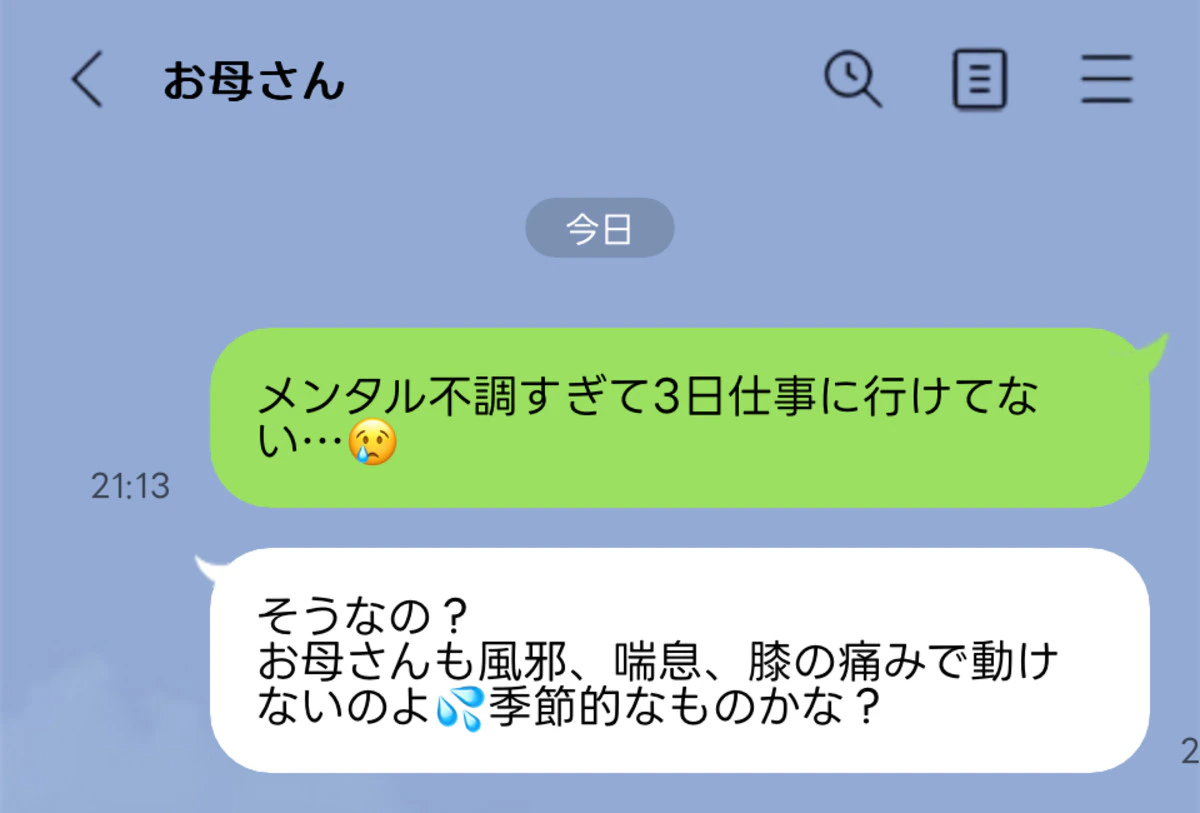 ママリでも、「何でも母の話に持っていかれる」という声や、「どうしても自分の体の不調の話になるため、親にはメンタル不調の話はしない」という声がありました。