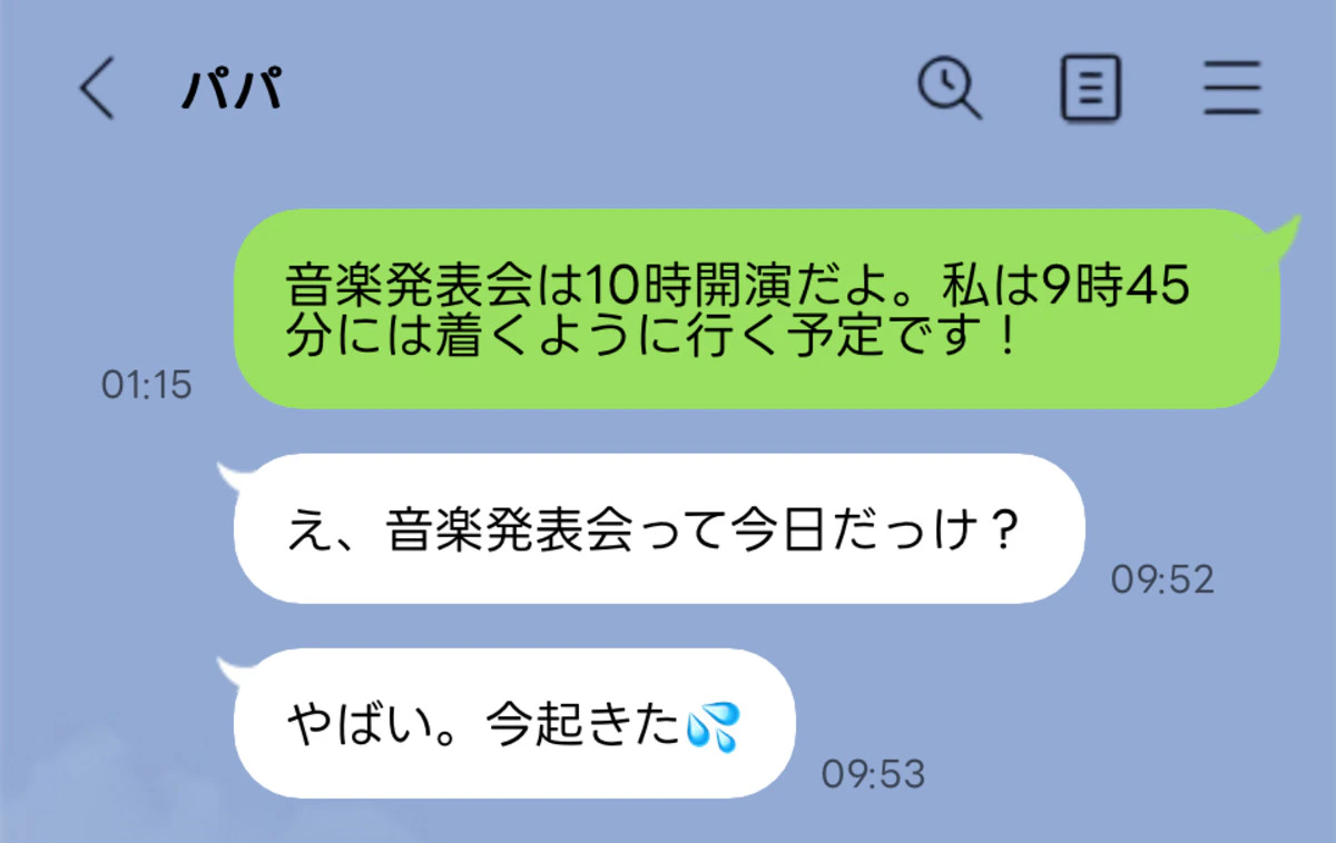 夜子どもたちと寝落ちしてしまったのでまぁ念のため夜中に「わたしは何時ごろに幼稚園に着いてる予定!」って送っておきましたが当日の朝連絡こなくて音楽会が始まる直前に「え、今日音楽会だっけ?」ってLINEがきました…