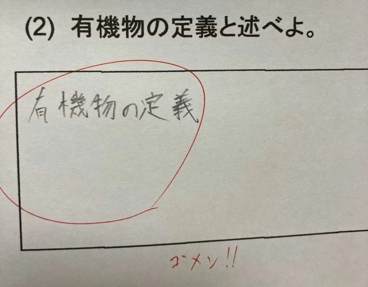 「有機物の定義『と』述べよ」と書かれているため、そのまま解答欄に「有機物の定義」と書いたあんせんとさん。先生としては、有機物の定義『を』述べよと書くつもりだったのですね。あんせんとさんの解答を丸にして、先生からの「ゴメン!」という潔い言葉に思わずほっこり。誤字によって不正解にはできず、悩んでしまう先生が想像できてしまいますね。