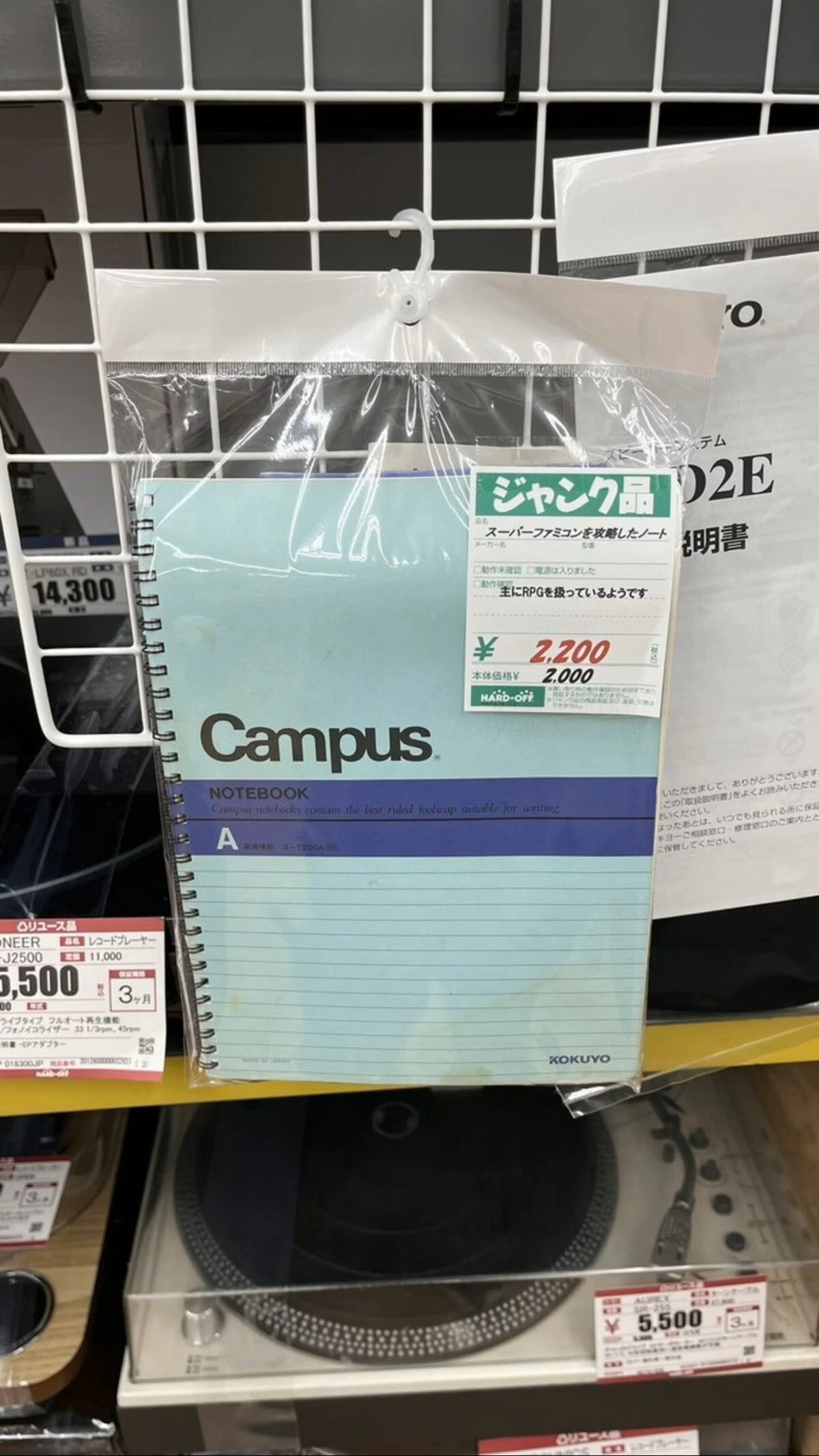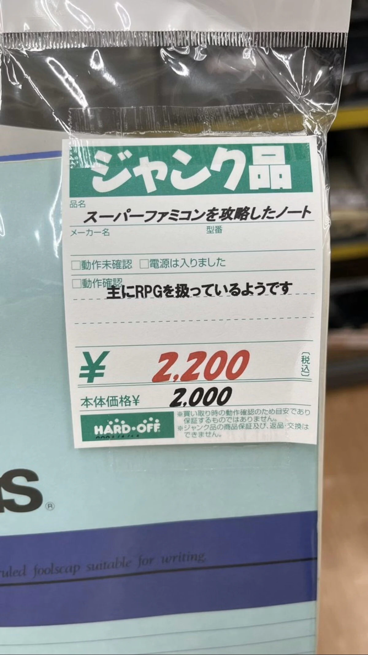 一見するとただのノートですが、その値段はなんと2,200円。プライスカードには「スーパーファミコンを攻略したノート」という文字があり、中にはどうやらRPGを中心としたゲームの攻略方法が書いてあるよう。ゲームが好きな人にとってはどんなゲームについて書かれているのか、どんな風に書かれているのか、想像力をかき立てられそうですね。