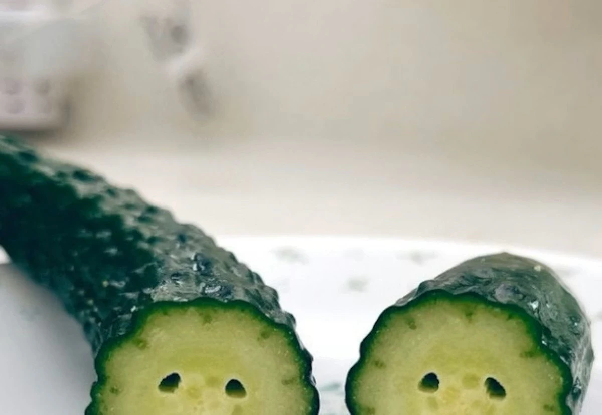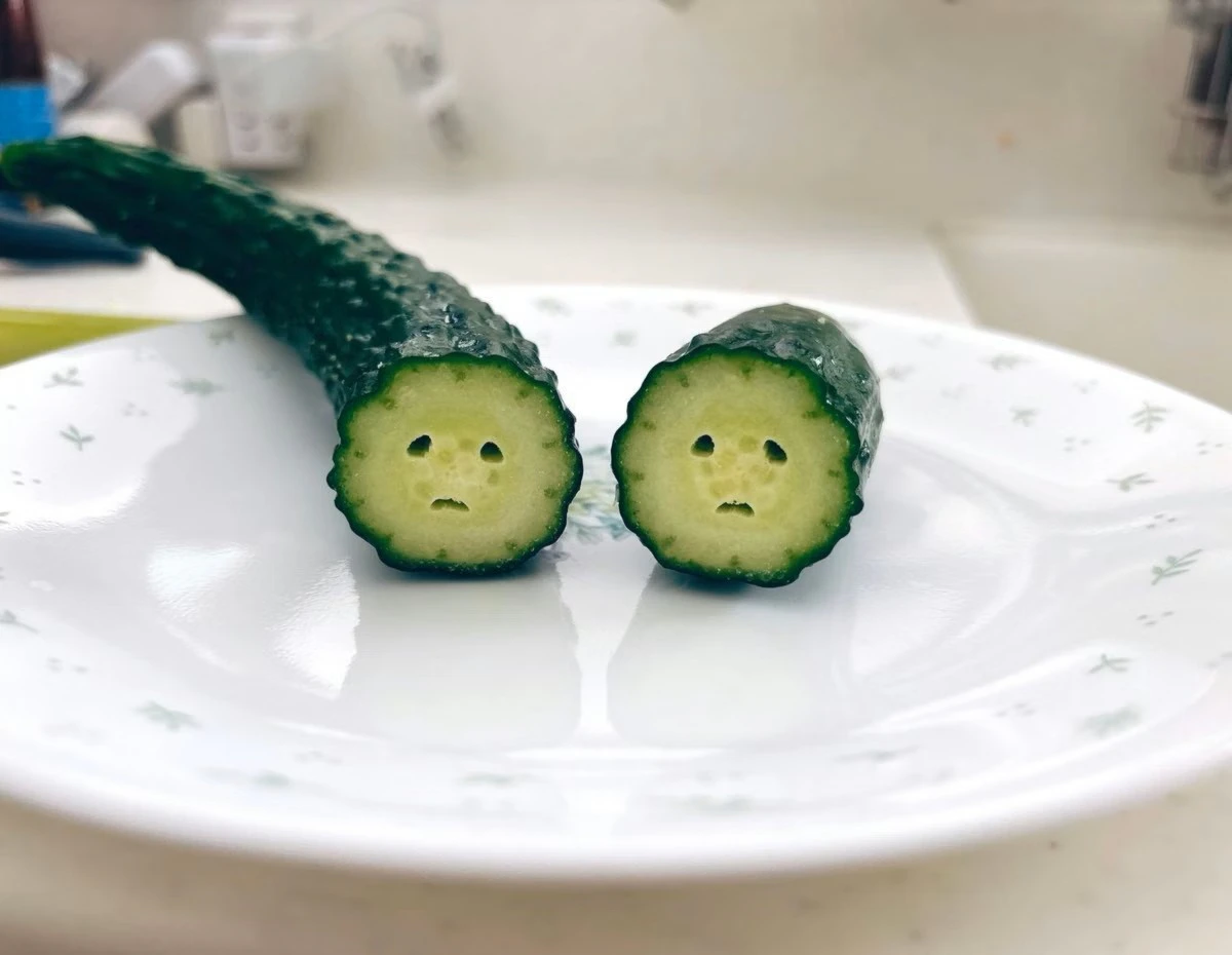 きゅうりを切ると、出てきたのは何とも悲しげな顔。目尻と口元が下がり、しょんぼりとしているような表情が印象的です。かわいいけれど、ちょっと食べるのがかわいそうになってしまいますよね。