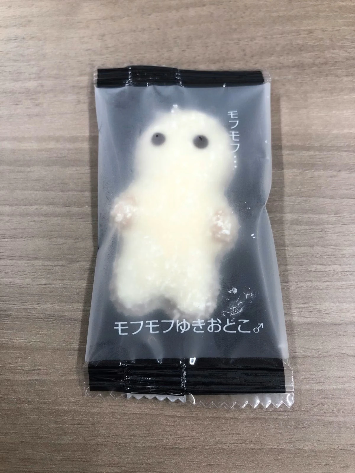 『モフモフゆきおとこ』と書かれたお土産。とてもかわいらしい見た目のお菓子ですね。ゆきおとこと書いているので東北など、寒い地方のものでしょうか。かわいいお土産に、話も盛り上がりそうです。「モフモフ…」の字も独特な雰囲気を醸し出しています。