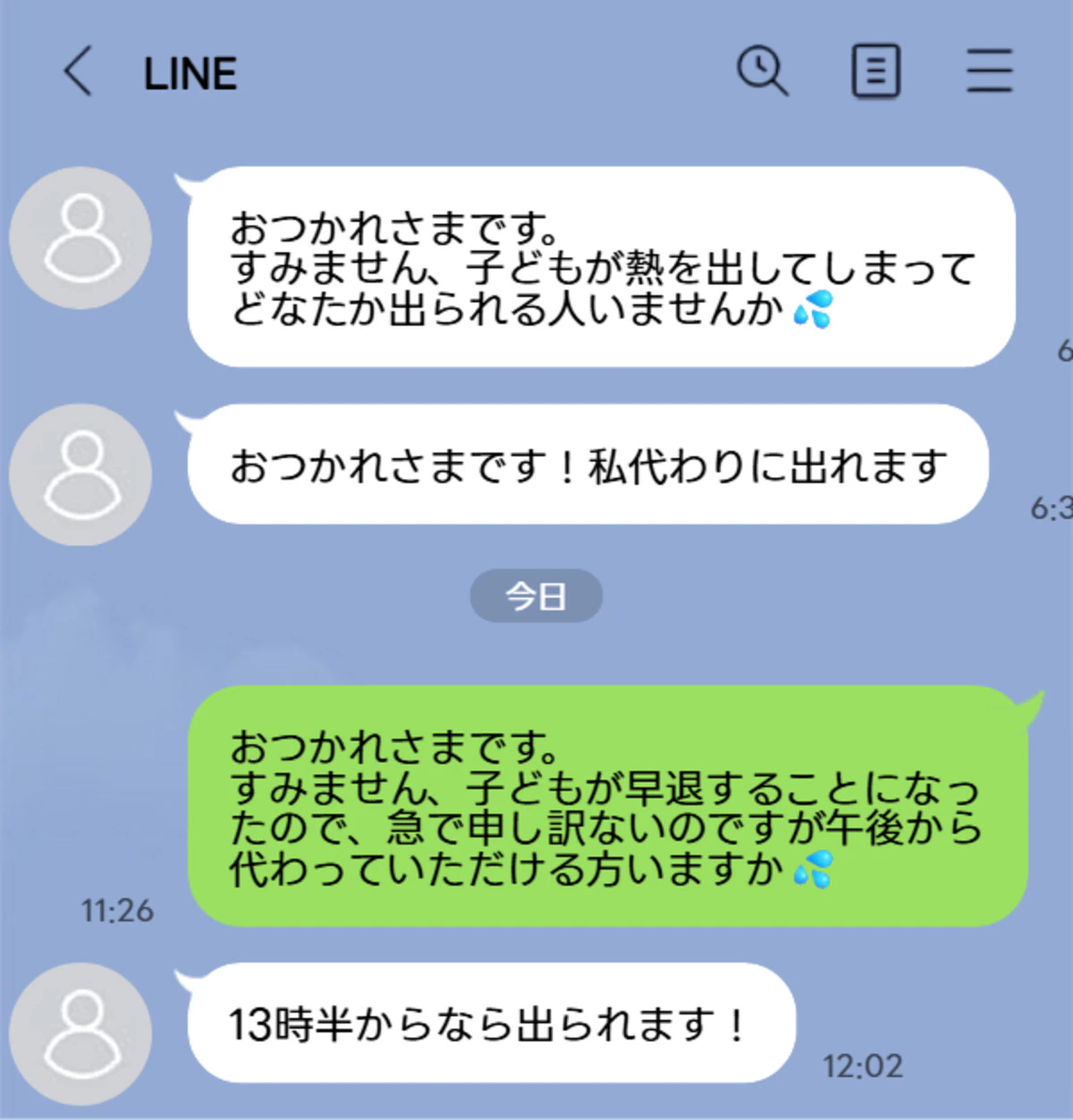 ギリギリの人数でやっていて、誰か休むたびにLINEで出れる人いませんか?と連絡きます。なので休みを取っていても出勤になるし、自分が休みたくても誰か代わりに出ると言うのが心苦しいのです。しかも代わりに出る人がパートさんなるいいのですが、社員の人だと社員の人は休みが少ないので申し訳ない気持ちになります。