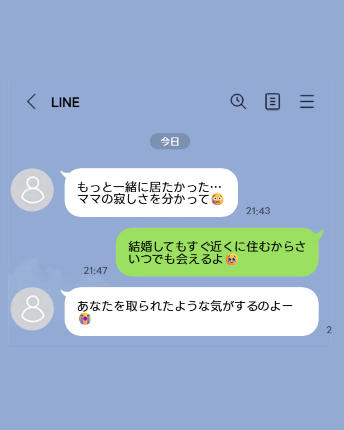 もっと一緒に居たかった、ママの寂しさを理解して欲しいだの、私に旦那(息子)を取られたような気がする。と言っててそれを目にしてから やば!と思うようになり笑