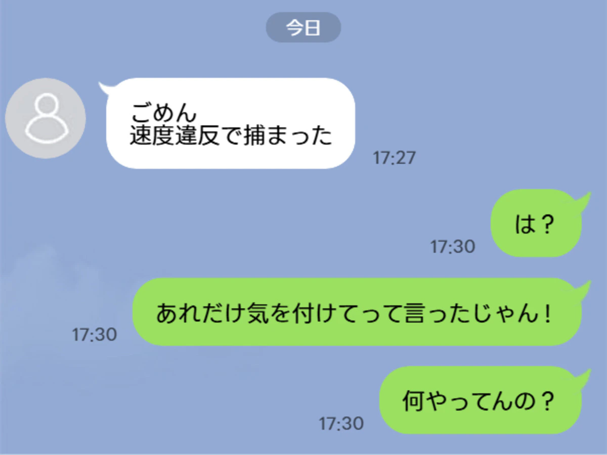 LINEでごめん速度違反で捕まったと送られてきて、そこから喧嘩になりました。というより呆れと絶望でボロクソ文句を言いました。