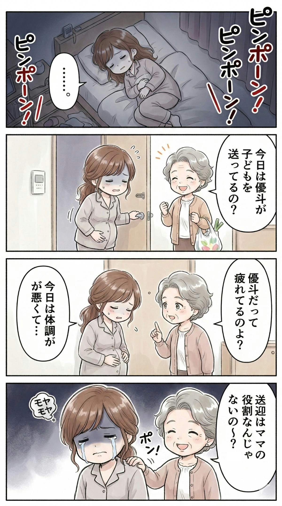 ある日のこと。 朝からおなかの張りがひどく、横になっていた。子どもたちを夫に登園させてもらったあと、インターホンが鳴ったけれど、もう義母に応対する気力もなかった。 だが、インターホンは鳴りやまない。