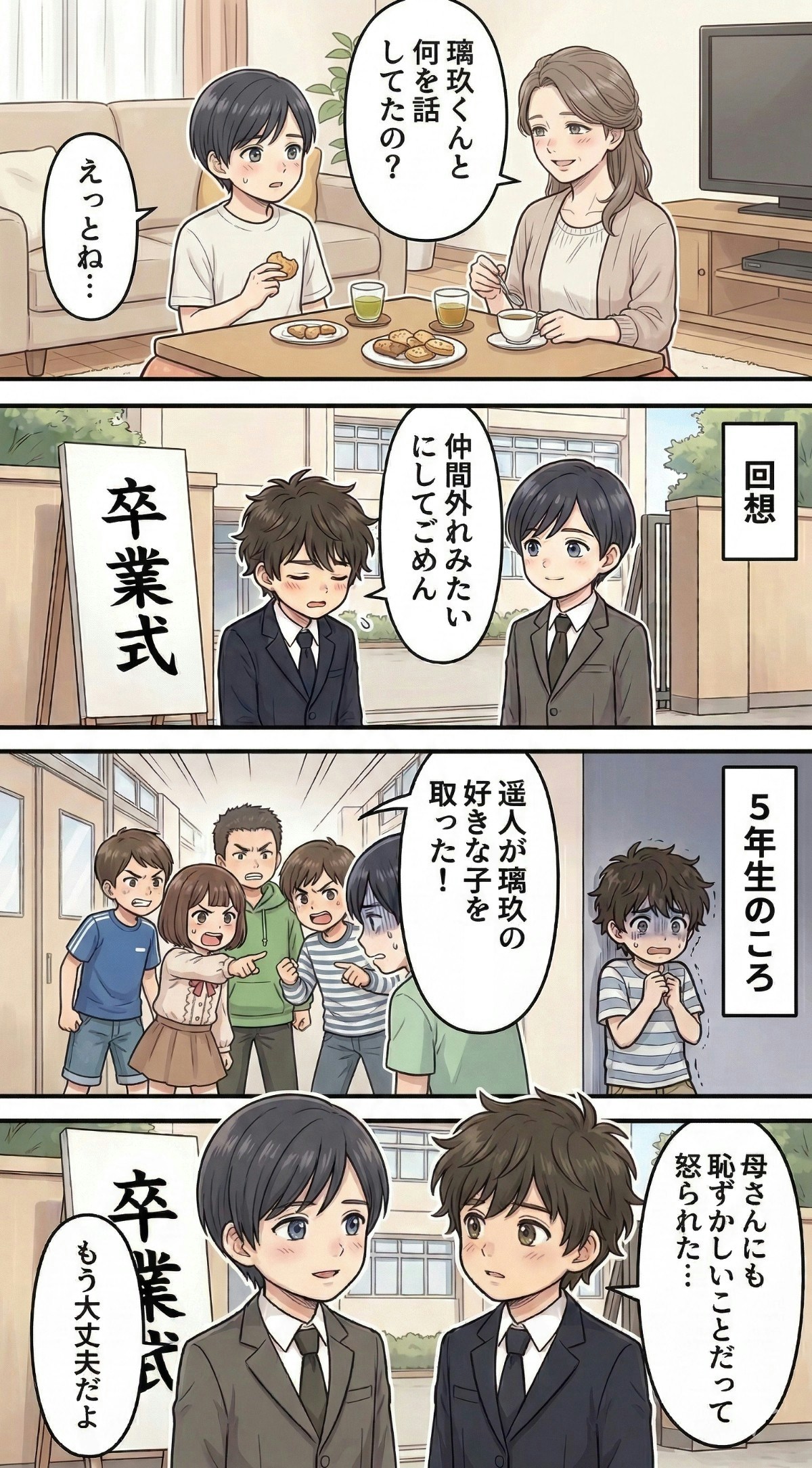 例の好きな子の噂は、噂のままで終わったそうです。そしてあの6年生が卒業してからも、璃玖君は遥人と距離を置いたままでした。6年生にあがってからも、距離を縮めることなく、遥人達は卒業の日を迎えてしまったのです。