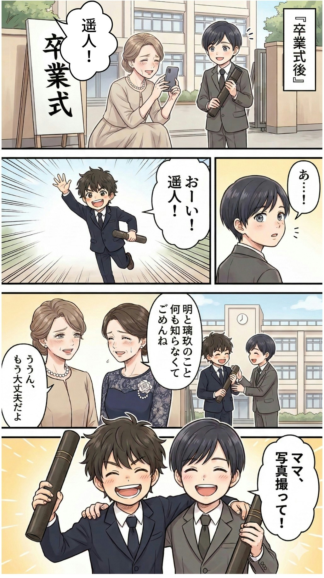 時はあっという間に過ぎ、遥人は小学校卒業の日を迎えます。紗希は、最後に璃玖と写真くらい…と思っていましたが、それも諦めるしかないと思っていました。遥人・翔・拓海の写真を撮り、帰ろうとしていたその時…。遥人を呼ぶ璃玖の声がしてー?
