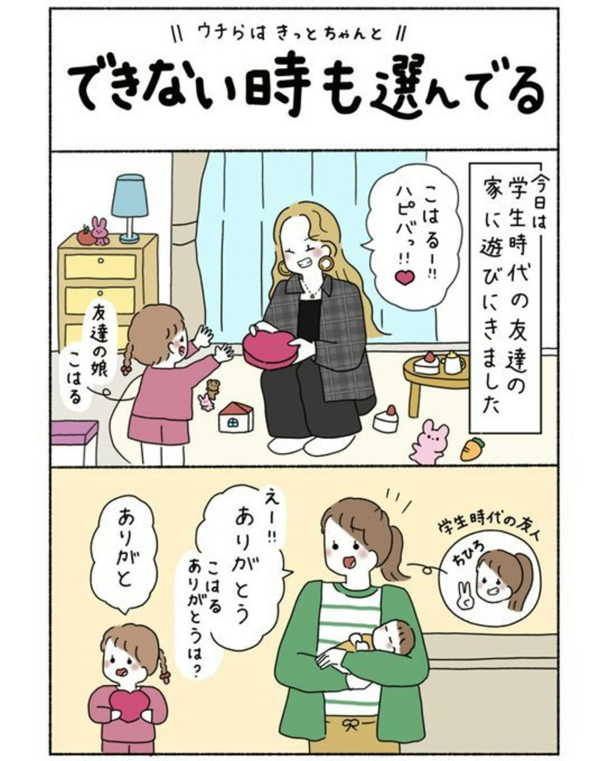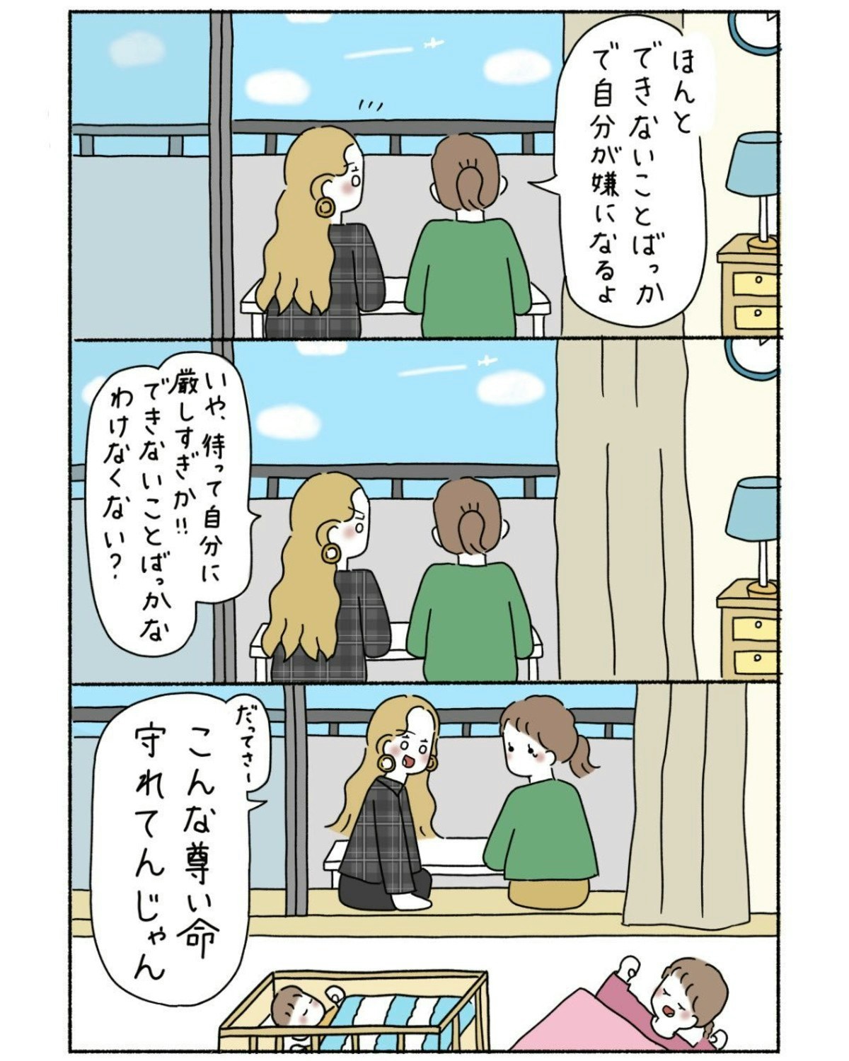 子どもと楽しく遊んだあと、子どもはおやすみタイムにはいります。今度は友人同士で「大人のネイル時間」を満喫。本格的なネイルセットで二人はテンション爆上げです。ついつい昔の自分たちを思い出し、感慨深い思いに浸ります。「できなかったんじゃなくてそれより大事なもの選んでる」というこの言葉、胸にじーんときますよね。育児や家事で忙しい毎日で、できなくなったことはたくさんある。でもそれはきっと「大事なものを選んできた証拠」です。