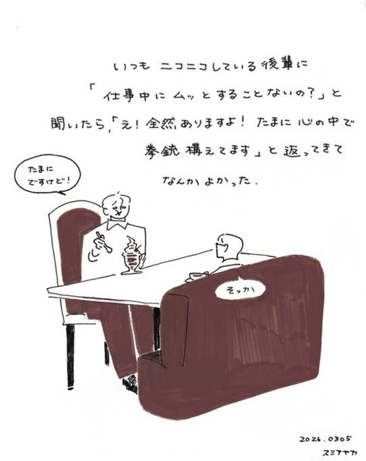 いつも穏やかな後輩。その姿を見て、スミアヤカさんは「仕事中にムッとすることないのかな」と、ふと疑問が湧いたそうです。後輩からは「全然ありますよ」と返事が。いつも穏やかに見える人も、本当はいろいろ思っているのですね。でもそれを表に出さず、自分の中で制御できるのは素晴らしいことだと思いました。