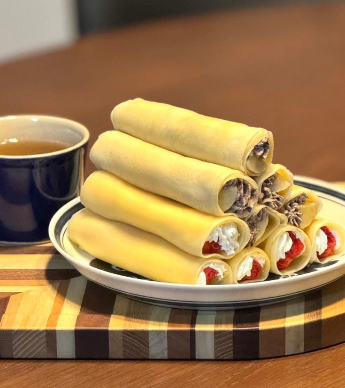 玉子焼き用のフライパンでクレープ生地を焼いたオッティーさん。まるで巻き寿司のようにクルクルッとすることで、大きさも形もキレイにそろえることができます。玉子焼きフライパン=玉子焼き用のイメージが強く…目から鱗のアイデア!