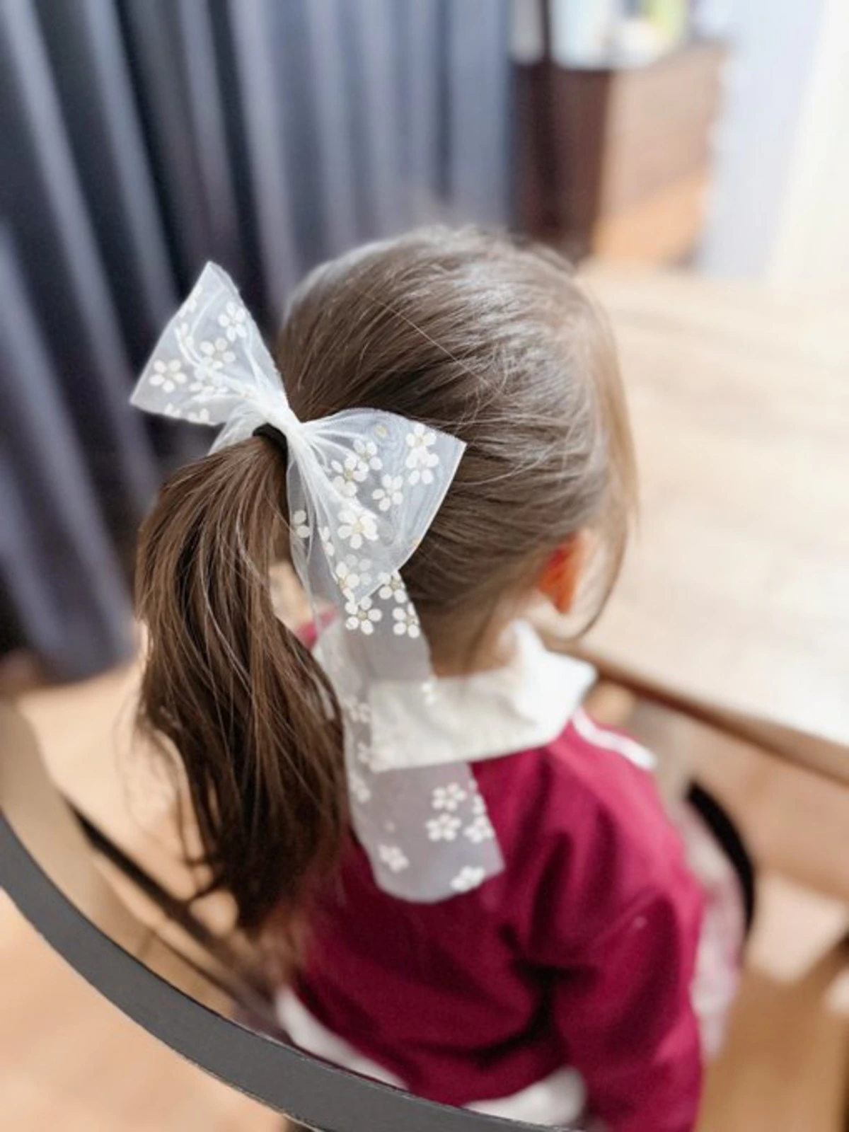 白い透かしのレースリボンに、小さなお花が散りばめられた、上品でかわいらしいヘアゴム。学校や外出先で、使うたびに娘さんは幸せな気持ちになるでしょうね、とっても素敵!ママさんが思わず赤面してしまうのも頷けます。