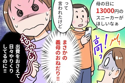 投稿者さんの実母はプレゼントを欲しがるタイプではないため、その真逆をいく義母の行為にモヤモヤが止まりません。家計が厳しい時期と重なってしまい、義母の要求どおり高額プレゼントを贈るべきか悩んでいるそう。