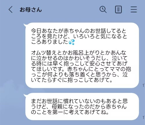 実母の育児に関する、長文LINEに「参っている」という投稿を紹介します。お世話の仕方について、長文でダメ出しをされたという、投稿者さん。おむつ替えや、保湿でギャン泣きする様子を指摘されたそう。投稿者さんなりに考え、急いでやっているのに、実母から、さまざまなことを言われて、どうしたらいいのか悩んでいるそうです。