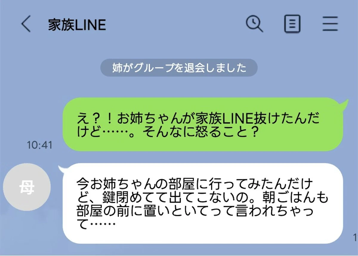 喧嘩した日は出かける用事があったので、篭っている姉に声をかけにいき、粘ったのですが完全無視でした。LINEブロック、家族LINEも抜け、着信拒否もされていました。喧嘩するたびにこれなので、もう縁を切ろうかな〜の相談もママリでさせていただいていたところでした。