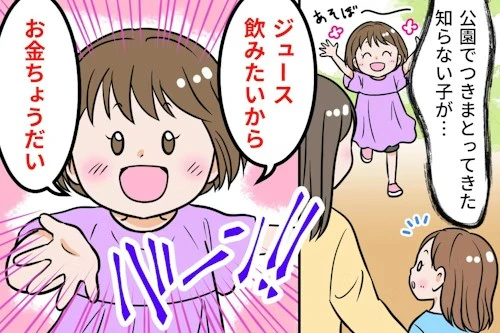 公園で会った子ども同士が仲良くしていると親はうれしいもの。しかし、その子どもが「お金ちょうだい」と言ったので投稿者さんは驚いてしまいました。父親と姉と一緒に来ていたのに、その子だけ投稿者さんと娘に付きまとっていたといいます。