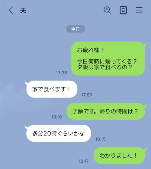 私「今日何時に帰ってくる?夕飯は家で食べるの?」