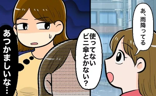 その子に、「使ってないビニ傘とかない?」って聞かれて、あつかましいなぁ...と心の中でムッとしてしまいました。