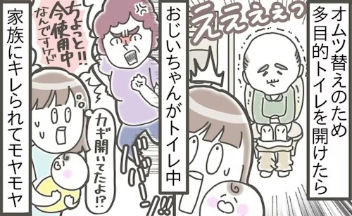 この記事ではママリに寄せられた声をご紹介します。投稿者のママは、おむつ替えをしようと多目的トイレに入ります。すると鍵がかかっていなかったにもかかわらず、中におじいさんがいてトイレの最中でした。とっさに謝ったものの、おじいさんの家族からも怒られモヤモヤ。こんなときどうしたらよいのでしょうか。