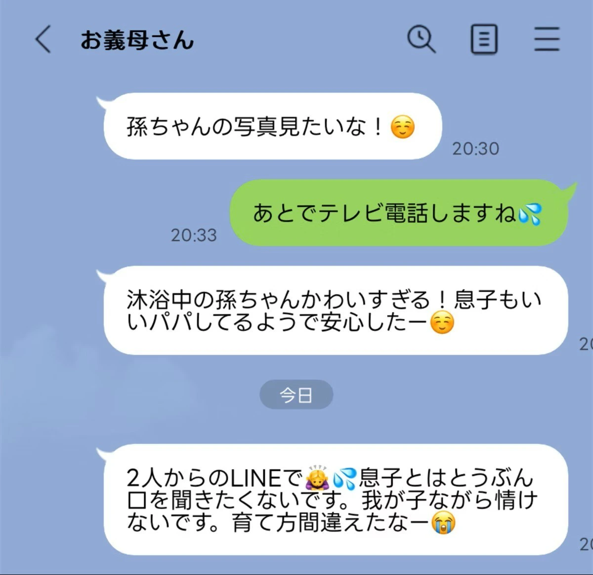 私が旦那が沐浴を手伝ってる写真を送ればいいパパしてるねーと私にわざわざ言ってくる、また別の日には旦那に私の悪口を言ってるような、起伏の激しい方です。