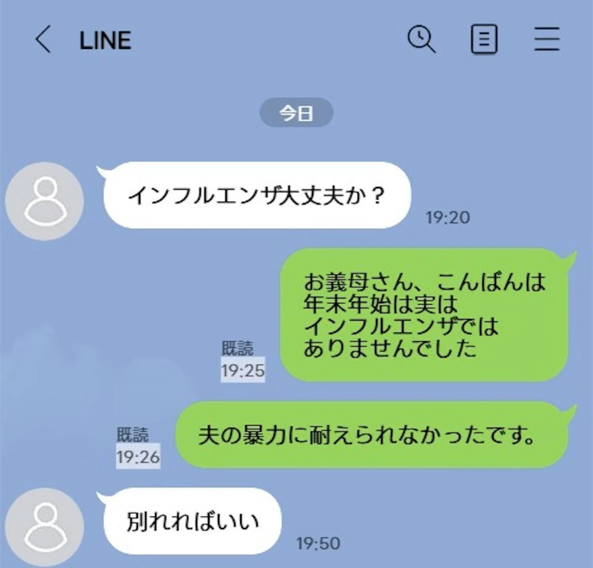 お正月に義実家への挨拶に行けなかったという投稿者さん。夫はその理由を「インフルエンザ」と義母に伝えていたようですが、実は夫からの暴力が原因でした。そうしたことを義母に伝えた投稿者さんですが、義母からの冷たい返事に唖然としています。