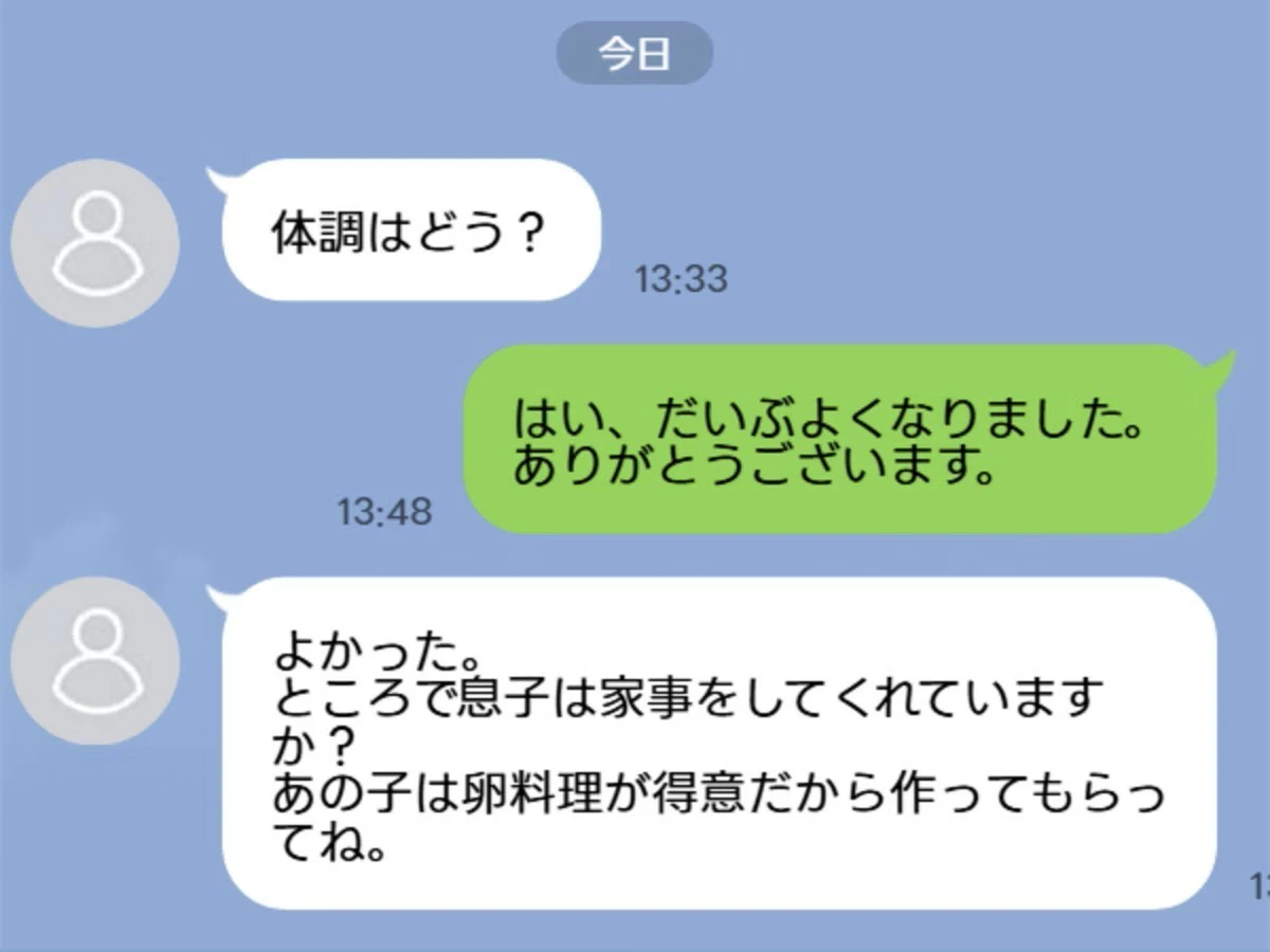 「◯◯さん、体調はどうですか?ところで◯◯(夫)は家事をしてくれていますか?あの子は卵料理が得意だから作ってもらってね。」