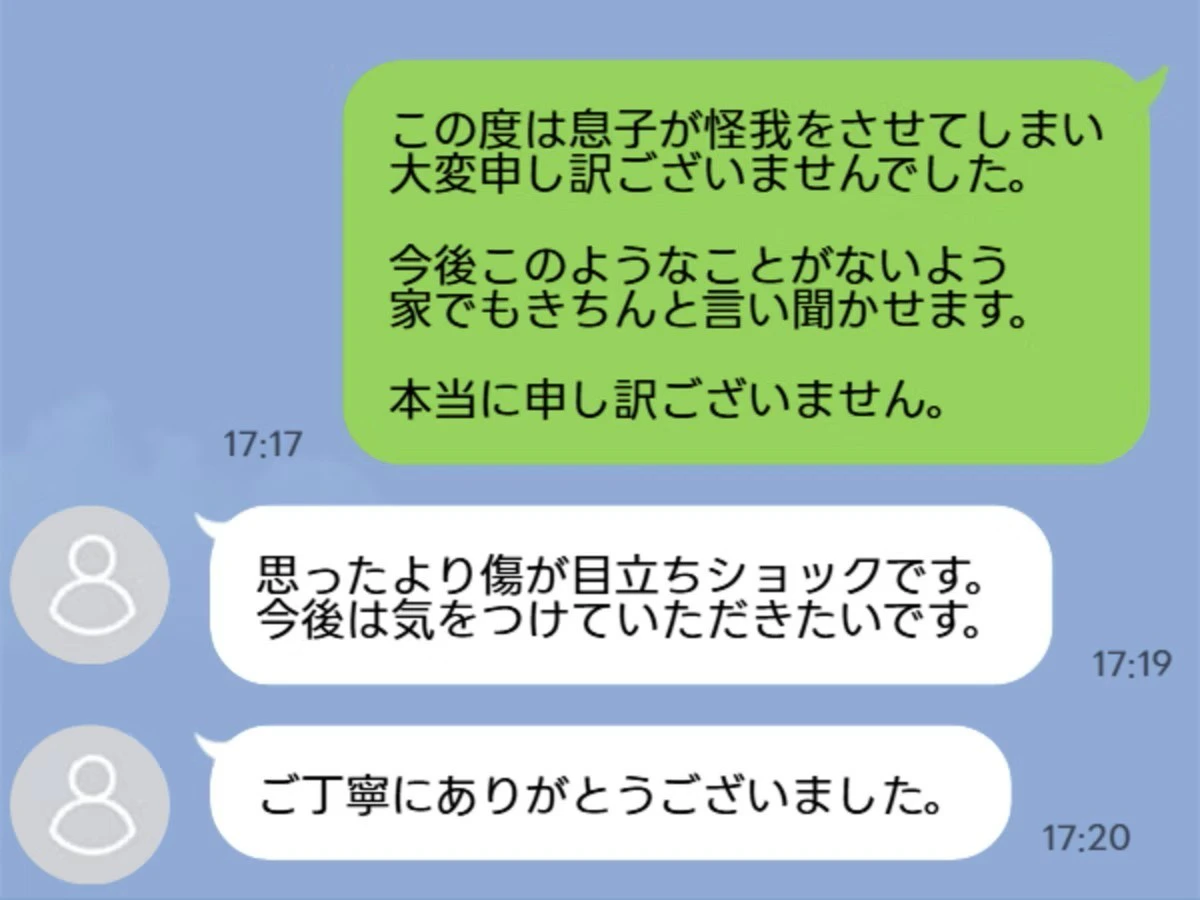 言いたいことを堪え、冷静に対処した投稿者さんを労う声が多数見られました。わざとでないとはいえ、怪我させてしまったことはもちろんいけないことですが、なぜそうなったのかお互いの子どもに話を聞くことも大切ですよね。