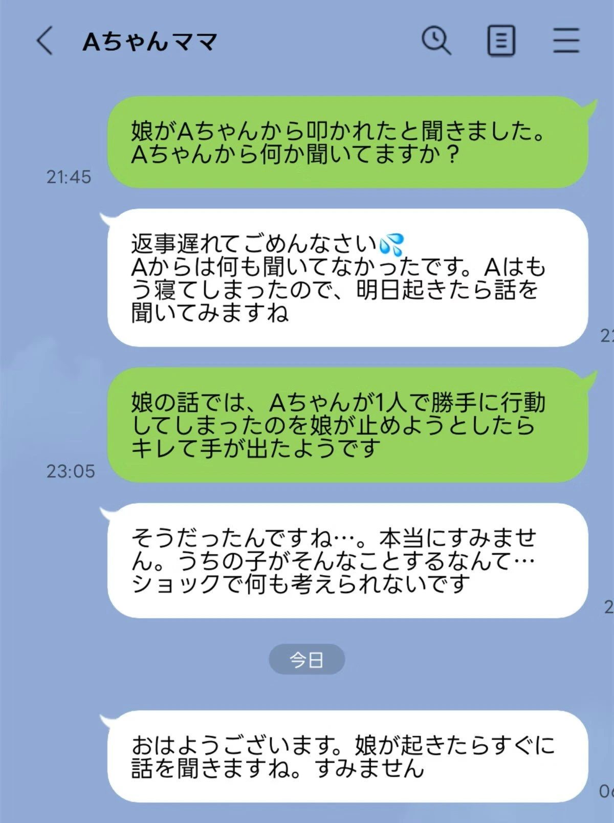 子ども同士のトラブルはこの先も起こりうること。一方的にどちらかが悪いと決めつけるのではなく、まずは話を聞いて何があったのかきちんと知ることが必要だと考えさせられる投稿でした。