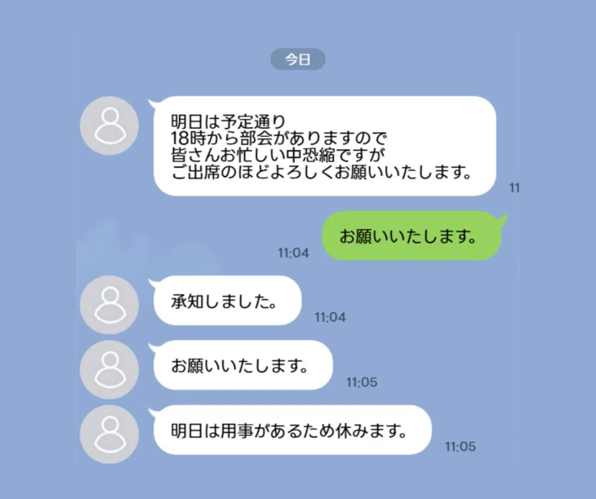 グループLINEでも発言なし、返事なし、たまに集まる部会を休む時だけ「休みます」のメッセージが来るのみ。