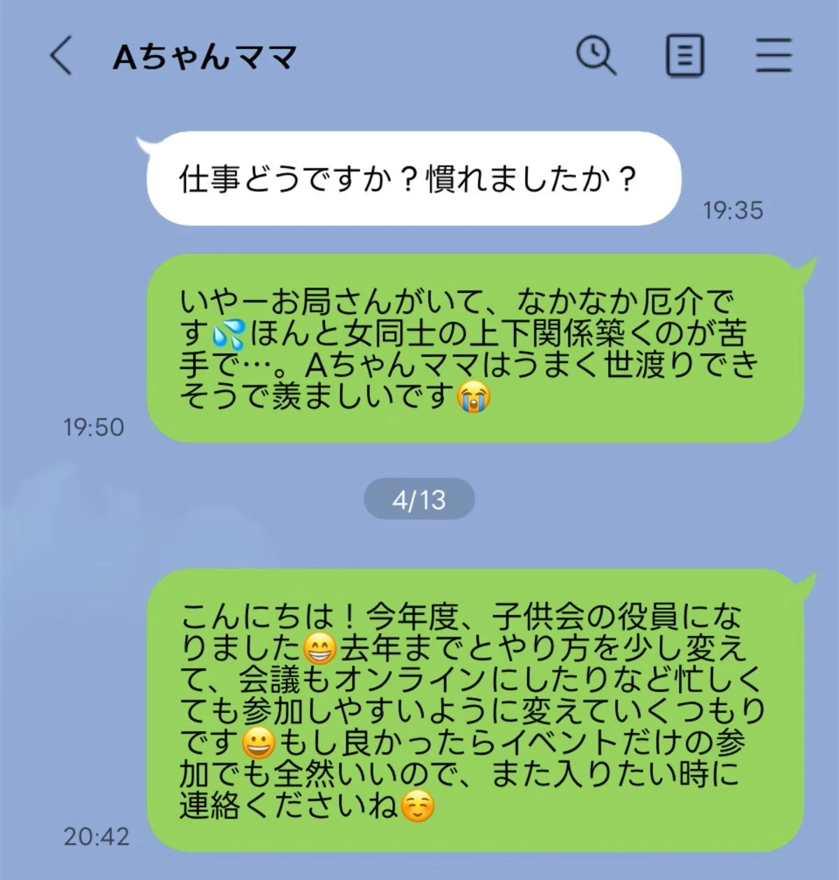 私が子ども会の役員になったので、その件で、勧誘まではいかないですが、いろいろ今後は方針変えてやっていくつもりなのでもしよかったらまた入りたいと思った時は連絡ください😊という要件の、少し長めのLINEを送りました。