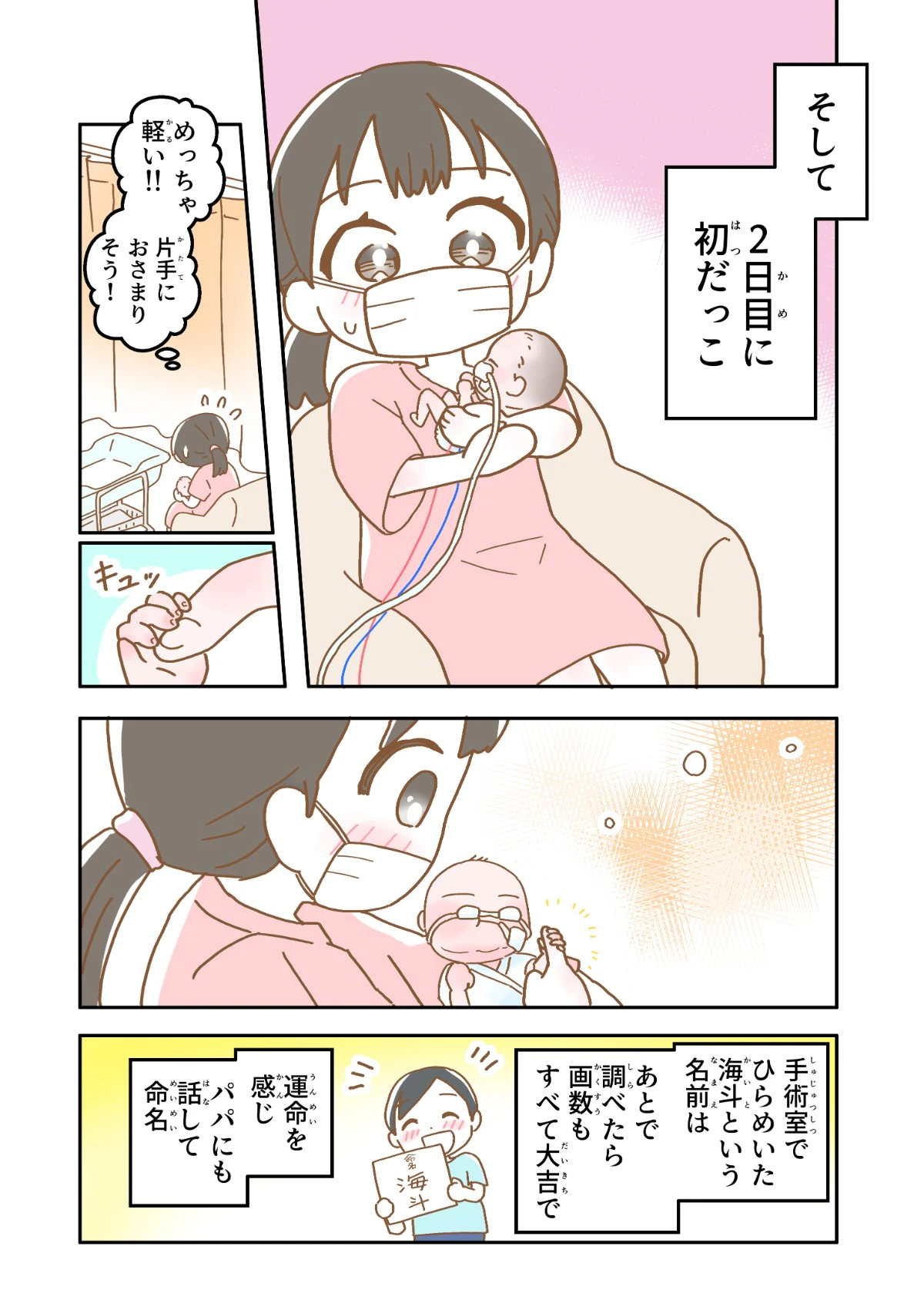 1812gという小さな体で懸命に生きる海斗くんを初めて抱っこした時の、「片手におさまりそう!」という驚きと愛おしさ。そして、意識が遠のく中で降りてきた「海斗」というお名前の画数が大吉だったなんて、まさに運命としか言いようがありませんね。