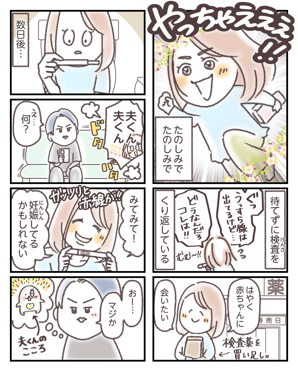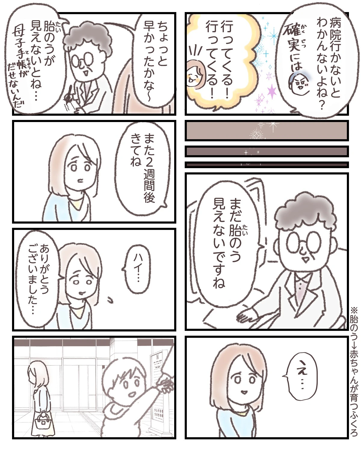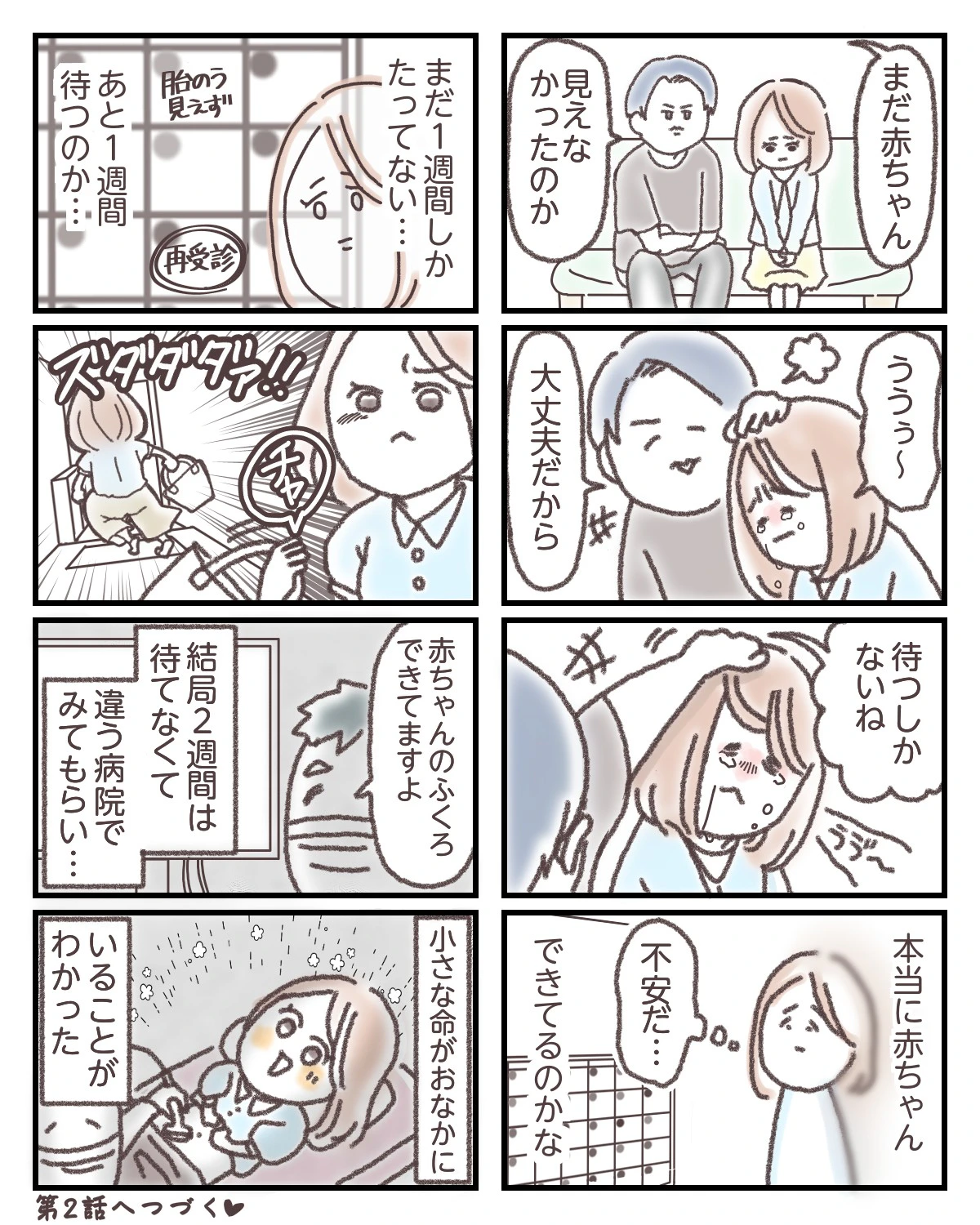 不安で涙をこぼすまゆこさんに、「大丈夫だよ」と声をかけて頭をなでる旦那さんの姿にも、ほっとさせられます。別の病院で無事に胎嚢が確認できたときの安心感は、きっとひとしおだったことでしょう。