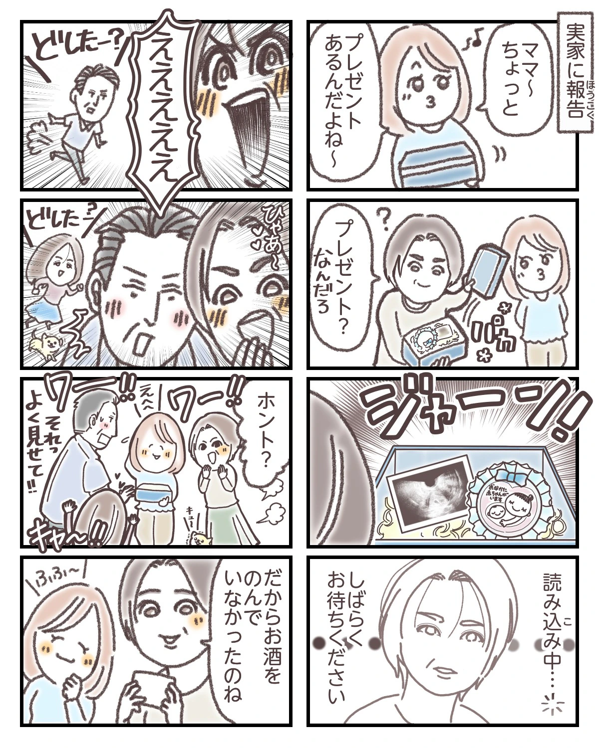 ご両親の嬉しそうな様子に、こちらまであたたかい気持ちになりますよね。「だからお酒を飲んでいなかったのね」というお母様のひと言も、思わずクスッとする場面でした。