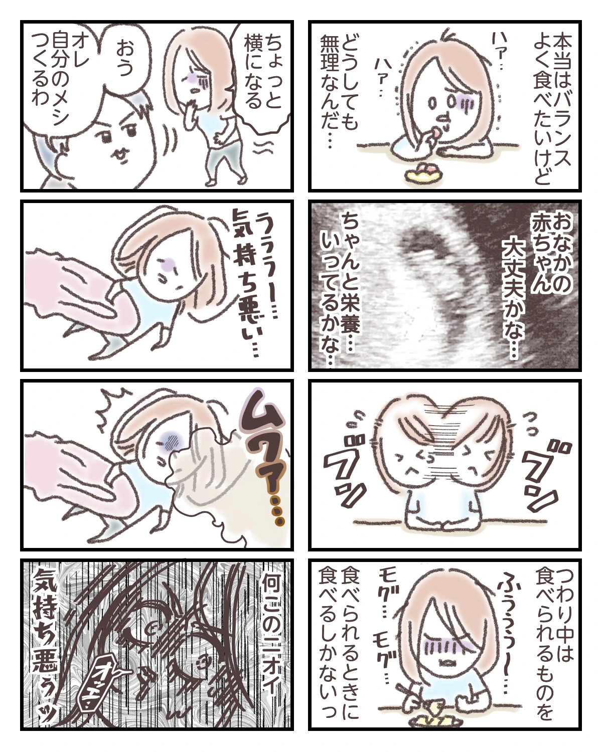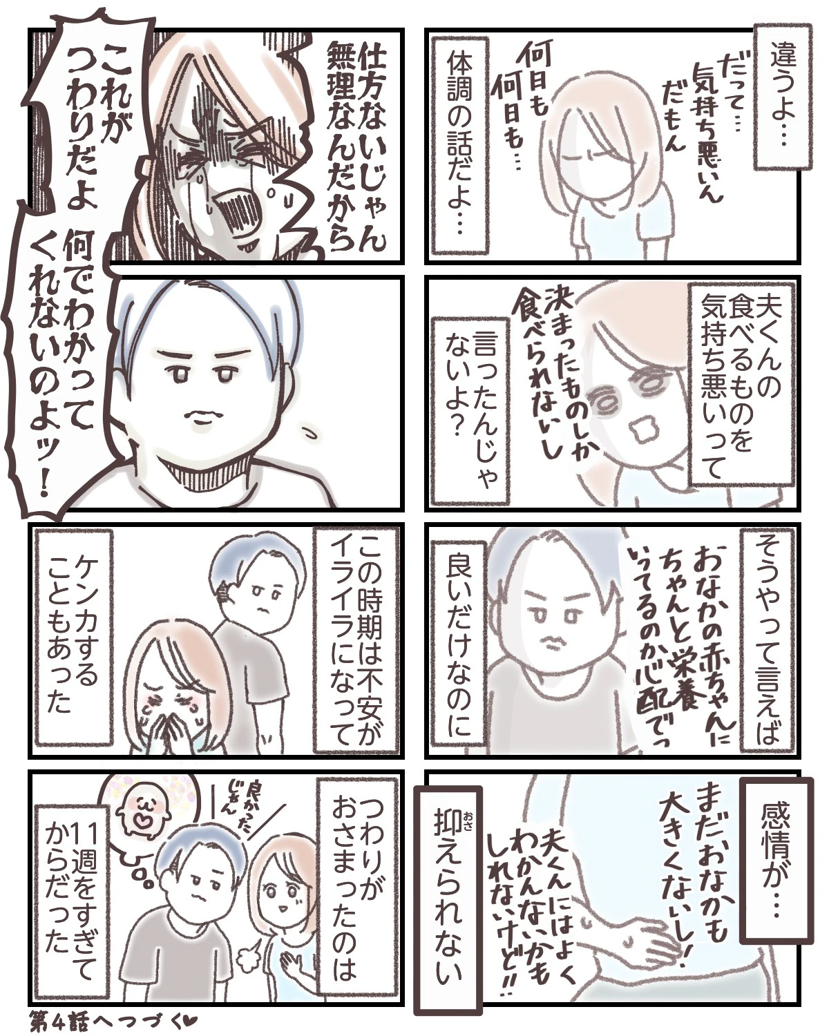 つわりのつらさから、家族との関係性にひびが入りかけてしまった経験がある方もいるのではないでしょうか。心のコントロールが効かない主人公のもどかしさと、夫の複雑な心境が伝わってきます、