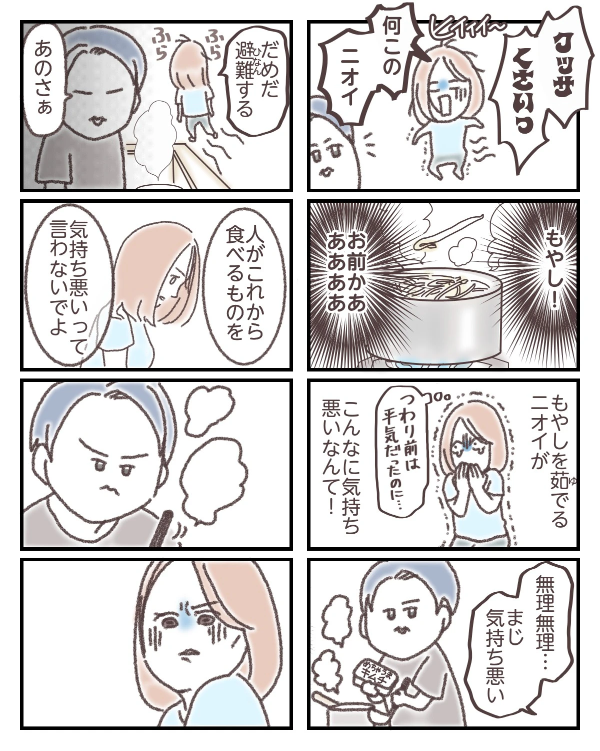 一方で、「人が食べるものを気持ち悪いと言わないでほしい」という夫の言い分も理解できる部分があります。ただ、常に気持ち悪さと向き合い続けるまゆこさんの不安やしんどさを思うと、「わかってほしい」と感情があふれてしまうのも無理はないように感じます。