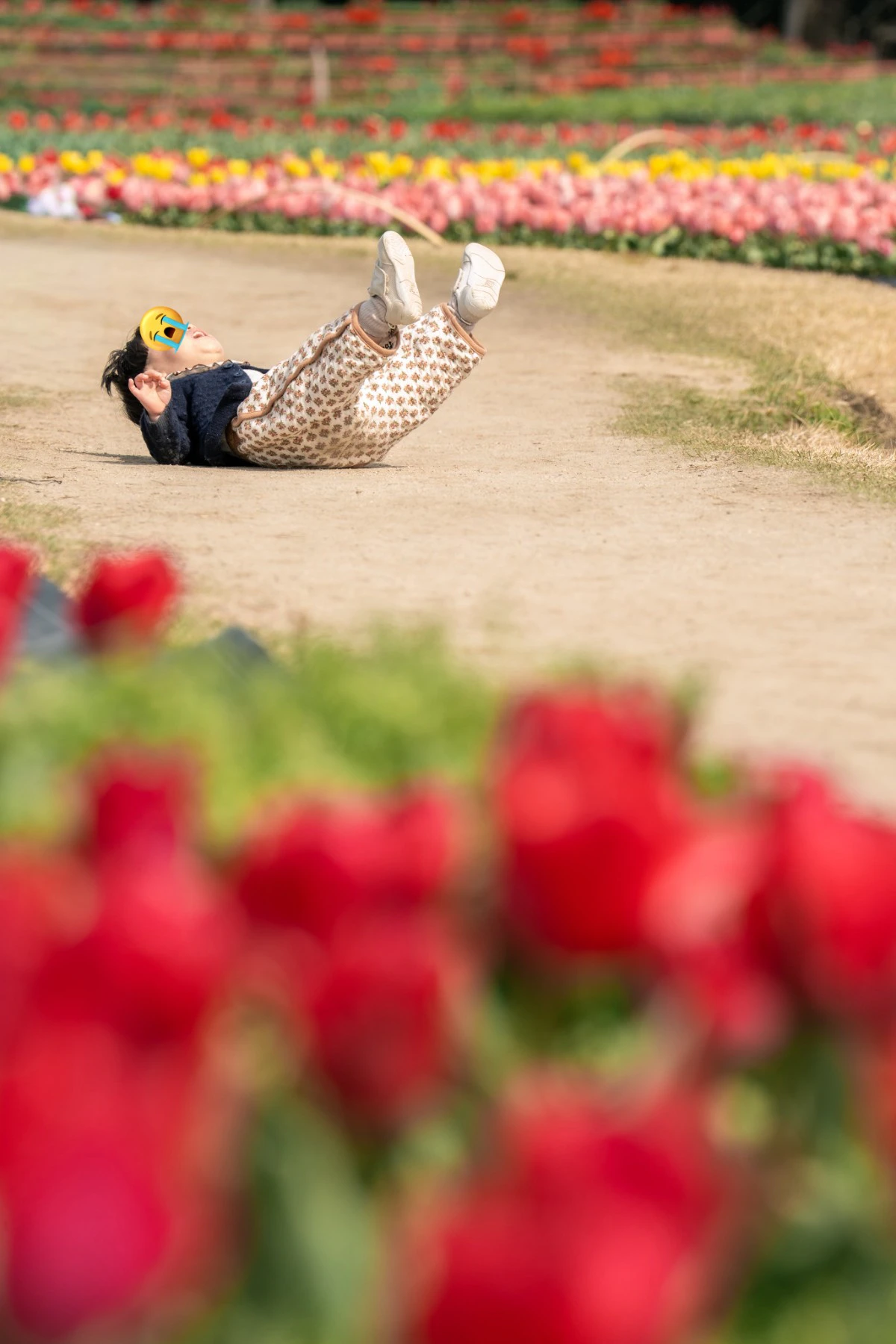 目の前に広がる真っ赤なチューリップ、そしてその手前で地面に転がり、足をピーンと伸ばして全身で「イヤイヤ」を表現するお子さん。