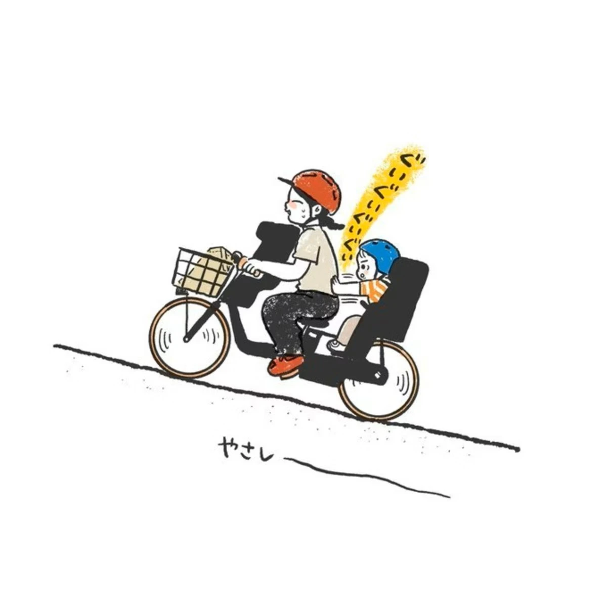 お子さんを連れて自転車で坂道を登っていただりさん。するとお子さんが後ろから背中をぐいぐいと押してくれていたようです。柔らかな絵柄と、坂の斜面に沿って書かれた「やさし~」というゆるっとした文字で、こちらもとっても癒されました。