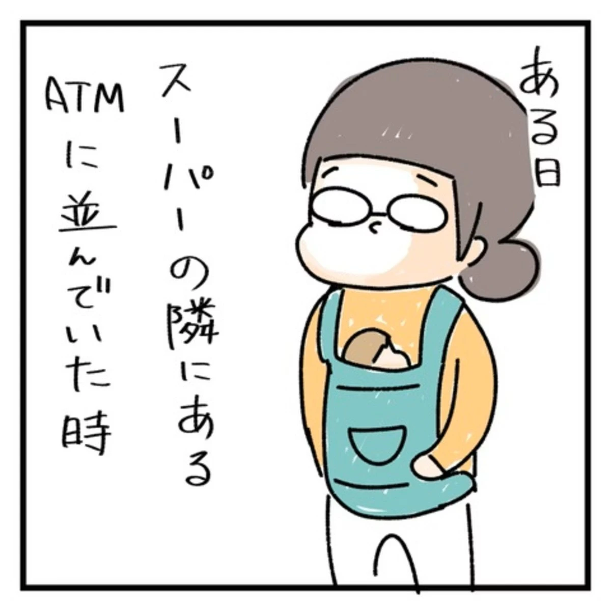 ある日赤ちゃんを連れて、ATMに並んでいた魚田さん。すると、抱っこひもから顔を覗かせたお子さんと、高校生たちの目が合い…?ほっこりさせられる育児絵日記です。