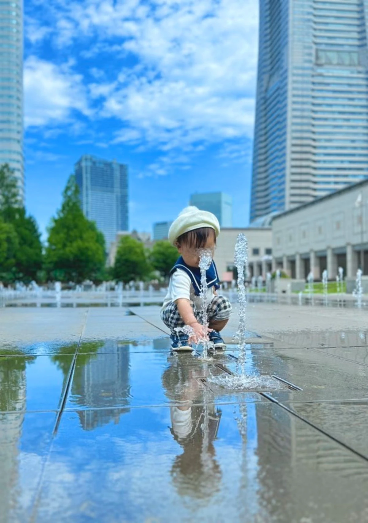 地面に薄く張った水に反射する、1歳の息子さんと青空。美しいお写真ですね。しかし、息子さんの鼻の先、手を伸ばす先には地面から吹き出る噴水が。親としては顔に勢いよく当たらないか心配してしまいますね。