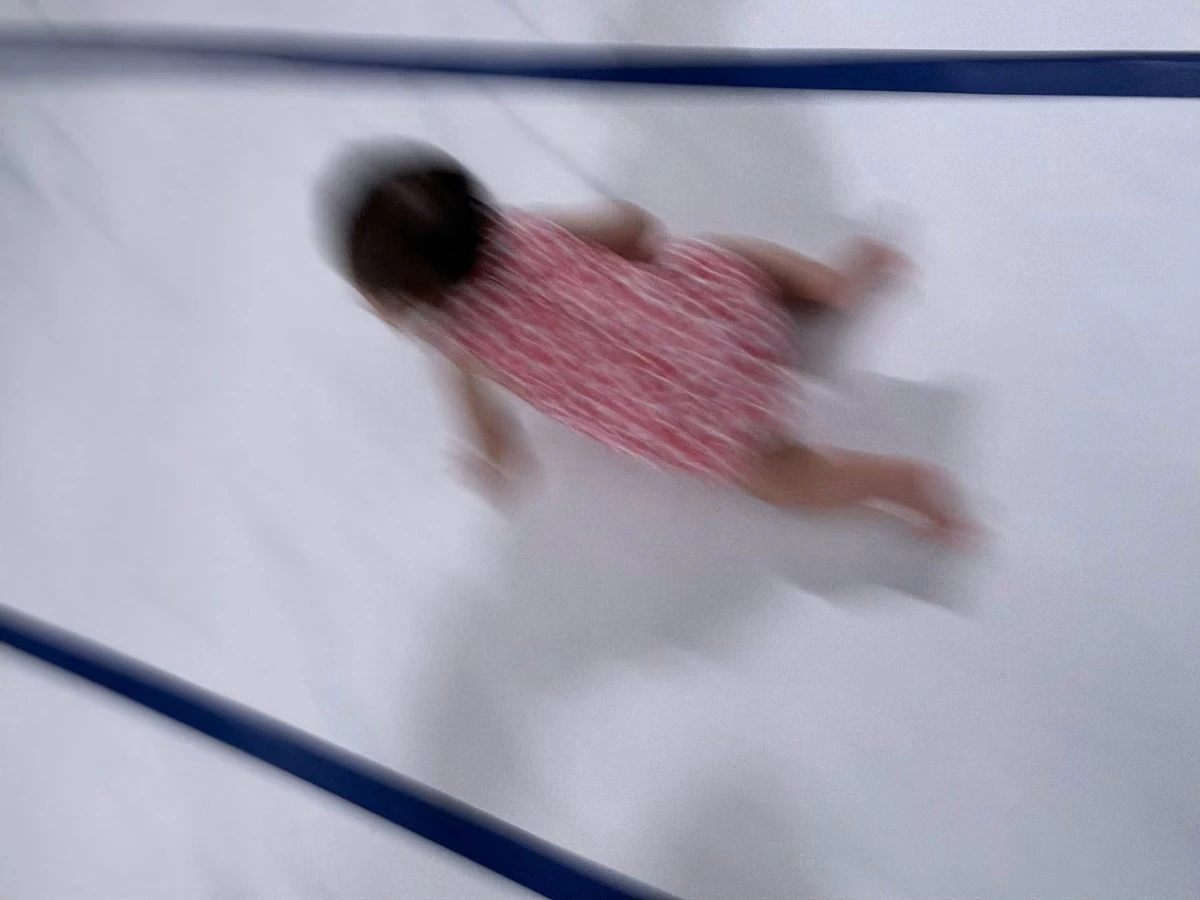 ハイハイが速すぎて、もはや残像しか写っていない姿に、思わずクスッと微笑んでしまいます。写真のアングルも絶妙で、まるで遠心力を味方につけたコーナリングを彷彿とさせますね。