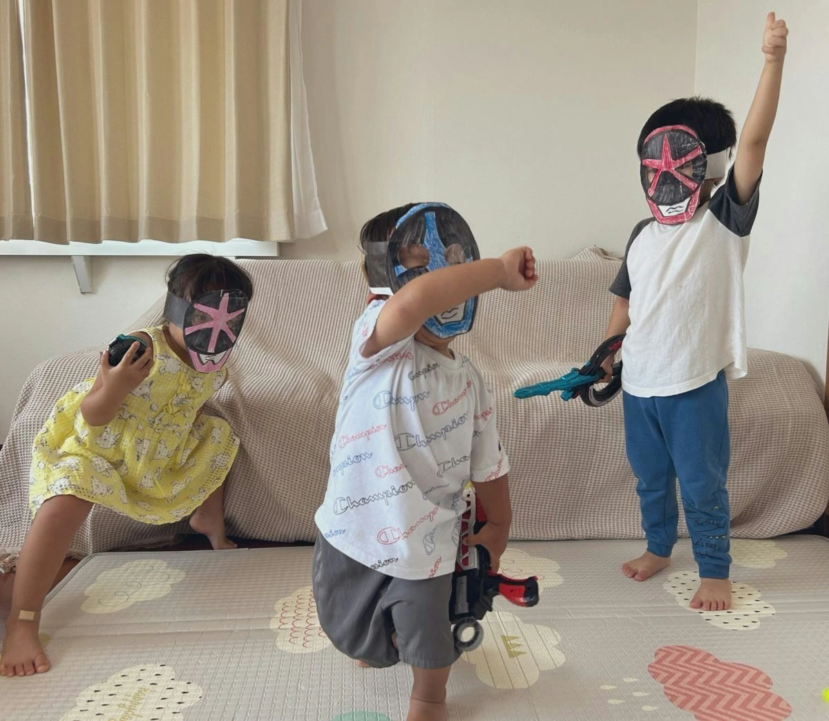 投稿者・ひみつのうつ子ちゃん☺︎さんはわが子と友人の子どもたちの3人で、ヒーロー風のお面を被った姿で写真を撮ったそう。3人はどんな姿を見せてくれたのでしょうか。