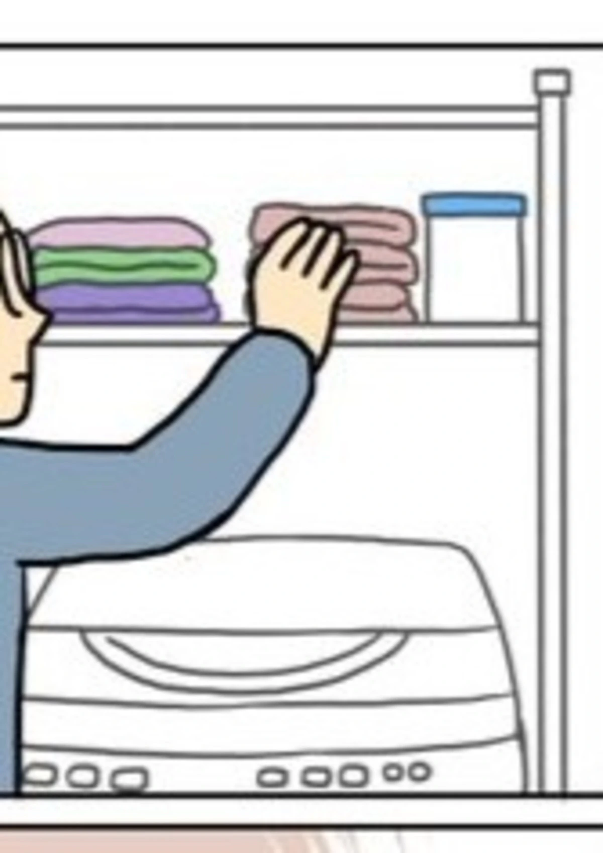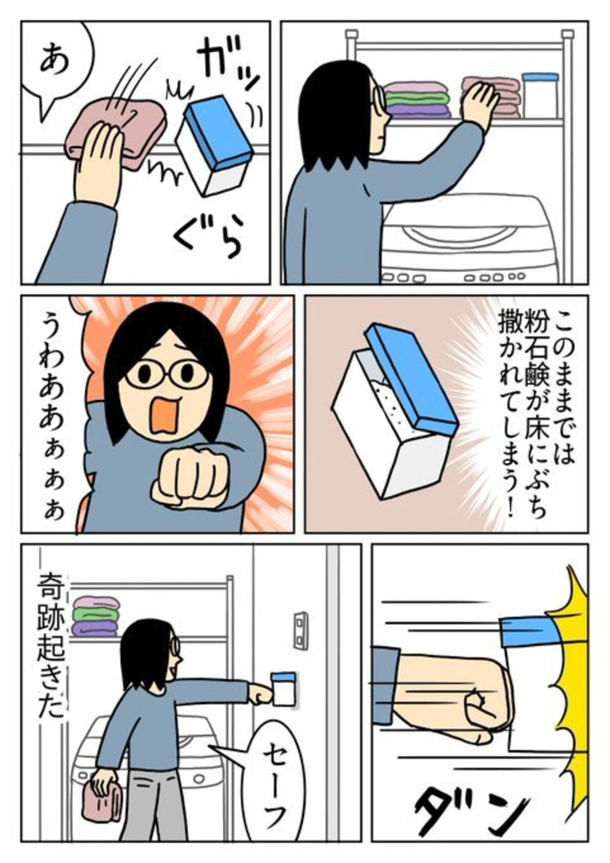 棚の上に置いてあった粉せっけんの箱が落下…!普通であれば「あ!やっちゃった」と見送ってしまいそうな瞬間ですが、キヨさんは無我夢中で拳を突き出し、壁と拳の間に箱を挟んで落下を防ぎます。一瞬のできごとにもかかわらず、見事にキャッチならぬストップを決めたその反射神経に、自分でもびっくりしてしまいますね。