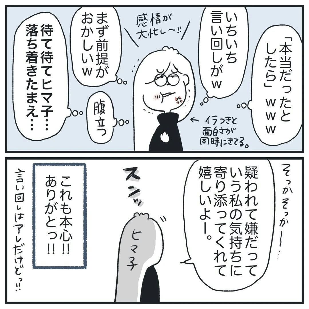 「疑ってしまう」思考は、長年その人自身に染みついてしまったクセのようなもの。簡単に変えることはできませんが、変えられるのは自分だけです。彼氏に寄り添うヒマ子さんの姿に、エールを送りたくなる作品です。