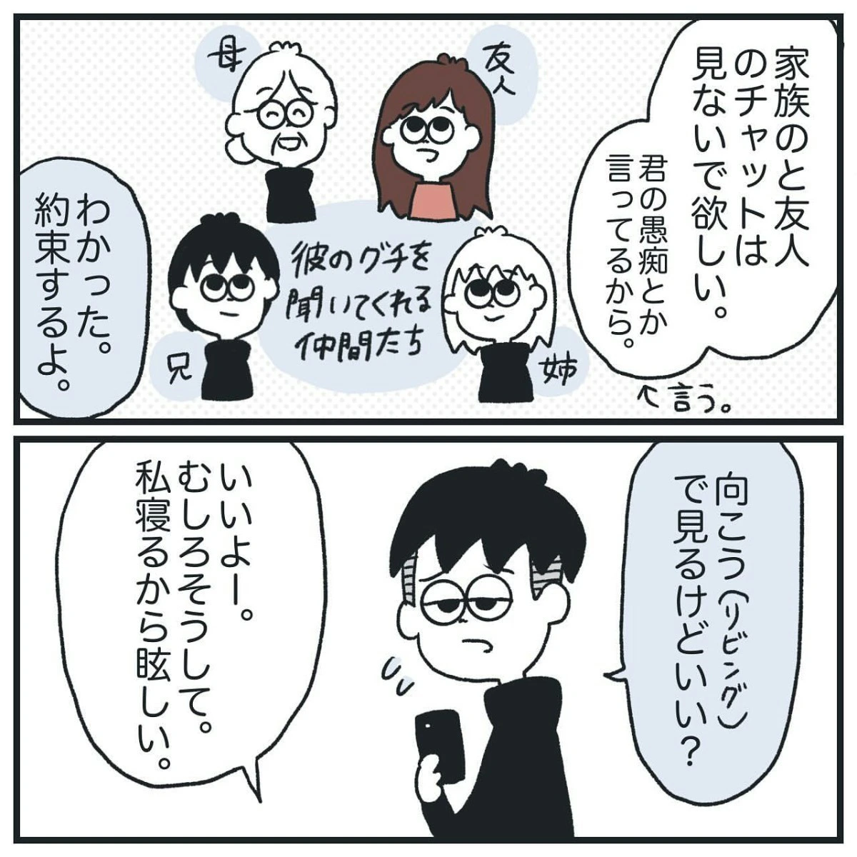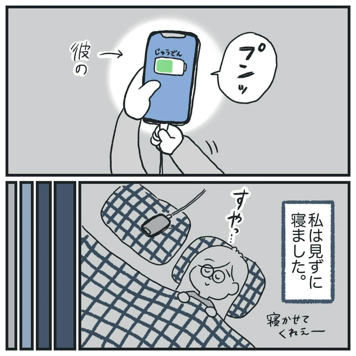 面倒だと感じたヒマ子さんは、寝室へサッサと切り上げます。ところが、寝室にまで来て「スマホを見せて」と言われたのです。嫌悪感を抱きつつ、スマホを差し出します。そして翌朝、彼氏から「怪しいのはなかった、ごめん」と謝罪されます…。