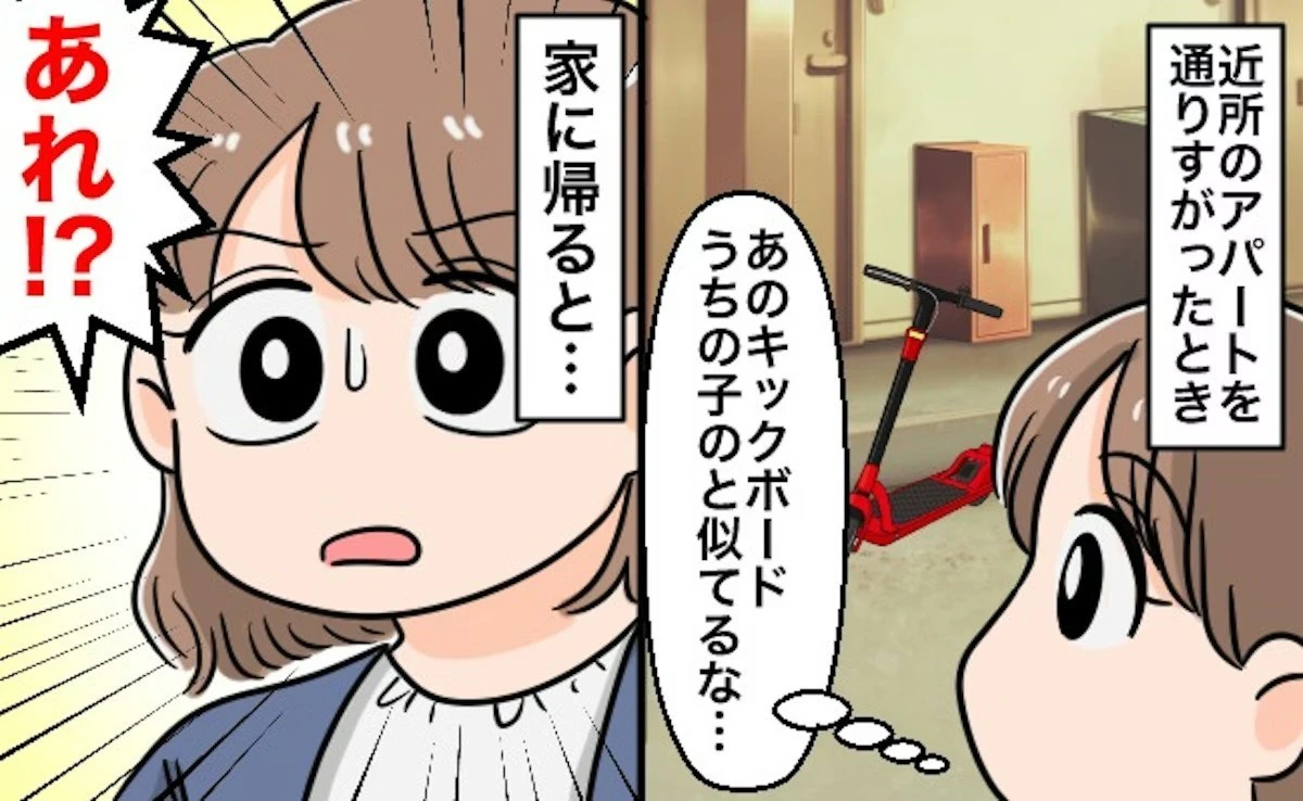 我が子のキックボードが自宅からなくなり、近所のアパートに置いてあることを発見した投稿者さん。キックボードには名前こそ書いていないものの、傷やパーツの欠けがあり、その位置も似ているそうです。