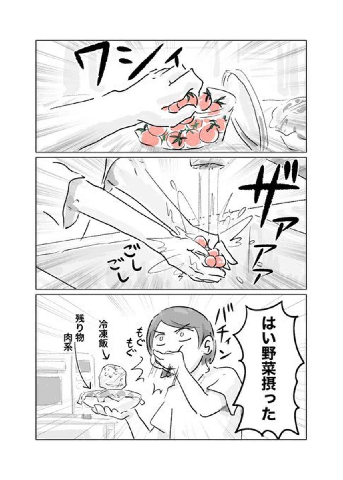 ミニトマトをサッと洗い、冷凍ご飯や残り物を片手に立食するさにぃがぁるさん。仕事や子育てなど、その他のことにエネルギーを使っていると、調理してゆっくり座って食べる余裕がないこともありますよね…。何かしら少しでも野菜を摂れば、栄養にバランスに気を付けた気になってしまうことに共感です!